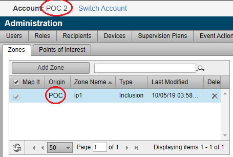 Linked/child zones are identified in the Origin column. Hover your mouse pointer over the origin name to see the parent account where the parent zone resides. The example below shows the Account Zones in sub account POC 2. Zone Name ip1 is a child zone managed in the parent account POC.