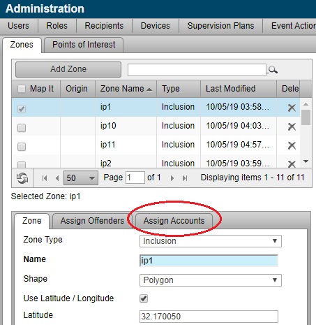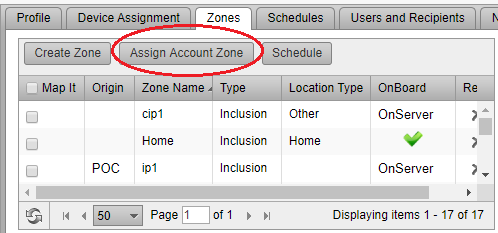 All Account Zones can now be displayed on the map at the same time. Use this feature to see all zones at the same time to ensure proper coverage. To display a zone on the map, check its corresponding check box in the Map It column. To remove the zone from the map, uncheck the box.