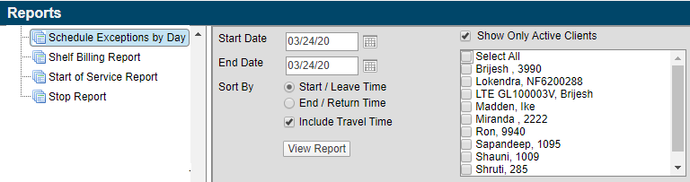 Include Travel Time – When this filter is selected, any travel time assigned to the schedule exception is used when sorting the report. For example, if a schedule exception begins at 3:00 PM, and allows one hour of travel time, it will appear on the report as 2:00 PM, representing the time that the client will leave. Similarly, if the schedule exception ends at 5:00 PM and allows one hour of travel time, the exception will appear on the report as ending at 6:00 PM.