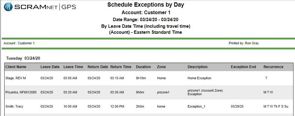 Start Date & End Date – Lists all schedule exceptions that occur in the given date range. Each day is separated by a page break. The start date can be up to one year ago. The maximum allowable report duration is seven days.