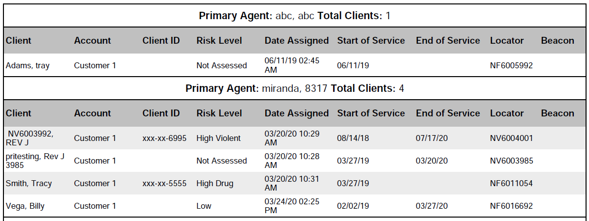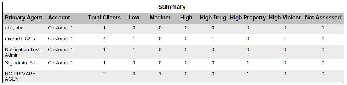 The existing Case Assignment report has been updated to include the client’s risk levels. Use this report to view each primary agent’s caseload. The report includes a summary section that shows the total number of clients, by risk level, for each primary agent. The report also includes a details section that lists each client.