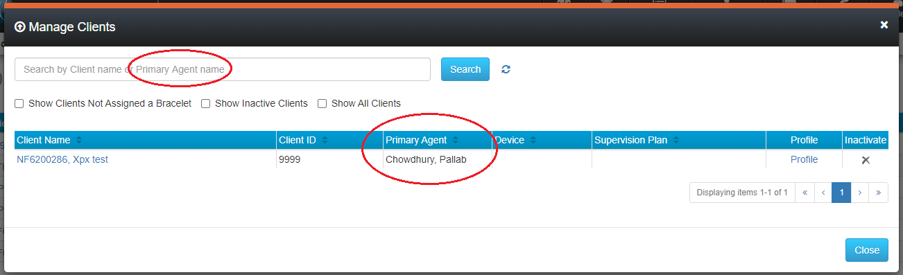 Two new features have been added to the Manage Clients pop up. To access the pop up, select the Manage->Clients top menu option. The Primary Agent assigned to a client will be listed in the Manage Clients pop up window, as shown below. Additionally, you may search clients by Primary Agent.