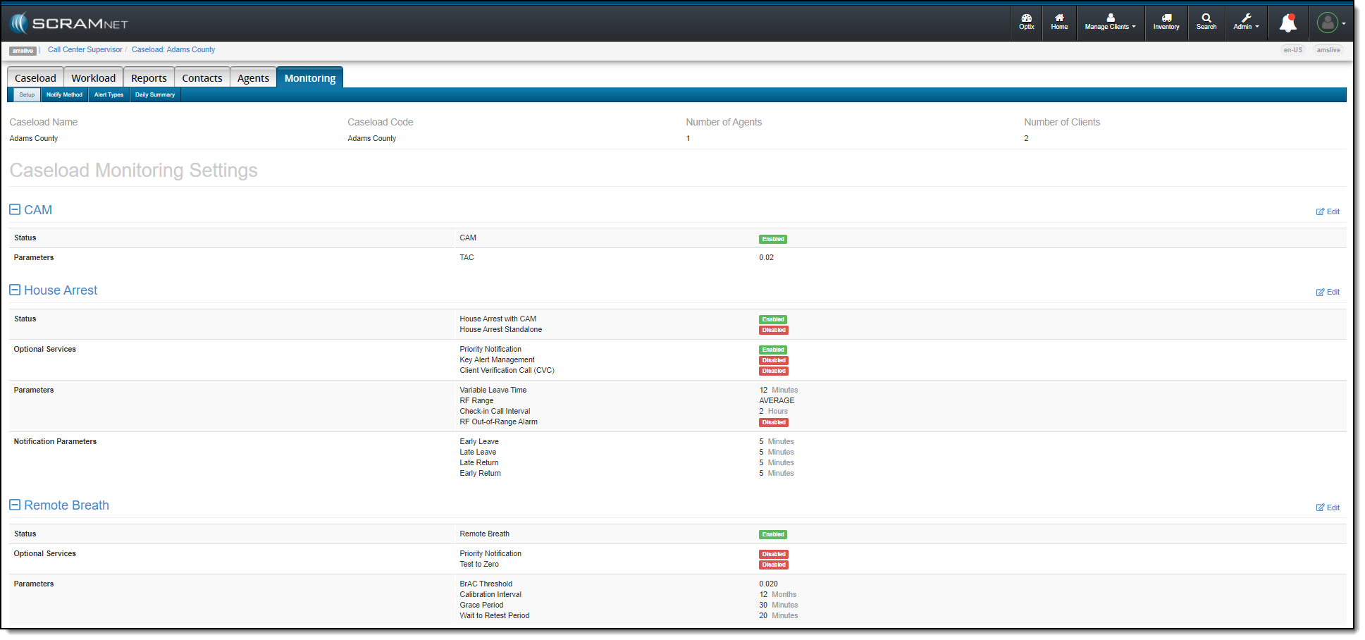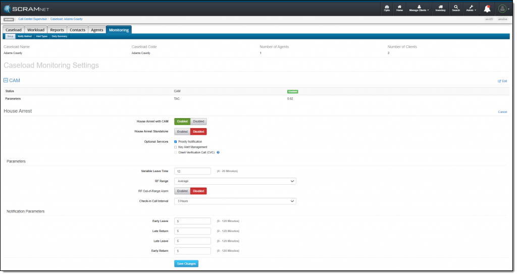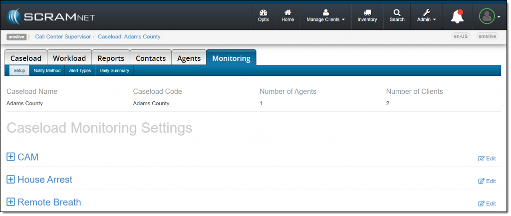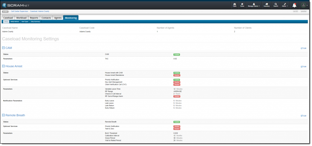 On June 10, 2021, SCRAM Systems® will be releasing an enhancement to the Monitoring tab on your Caseload page in SCRAMNET®. This enhancement updates how the monitoring types, optional services, and notification parameters selected for the caseload are displayed on the page. The functionality remains the same, the specific services and parameters are now grouped with the corresponding monitoring technology.