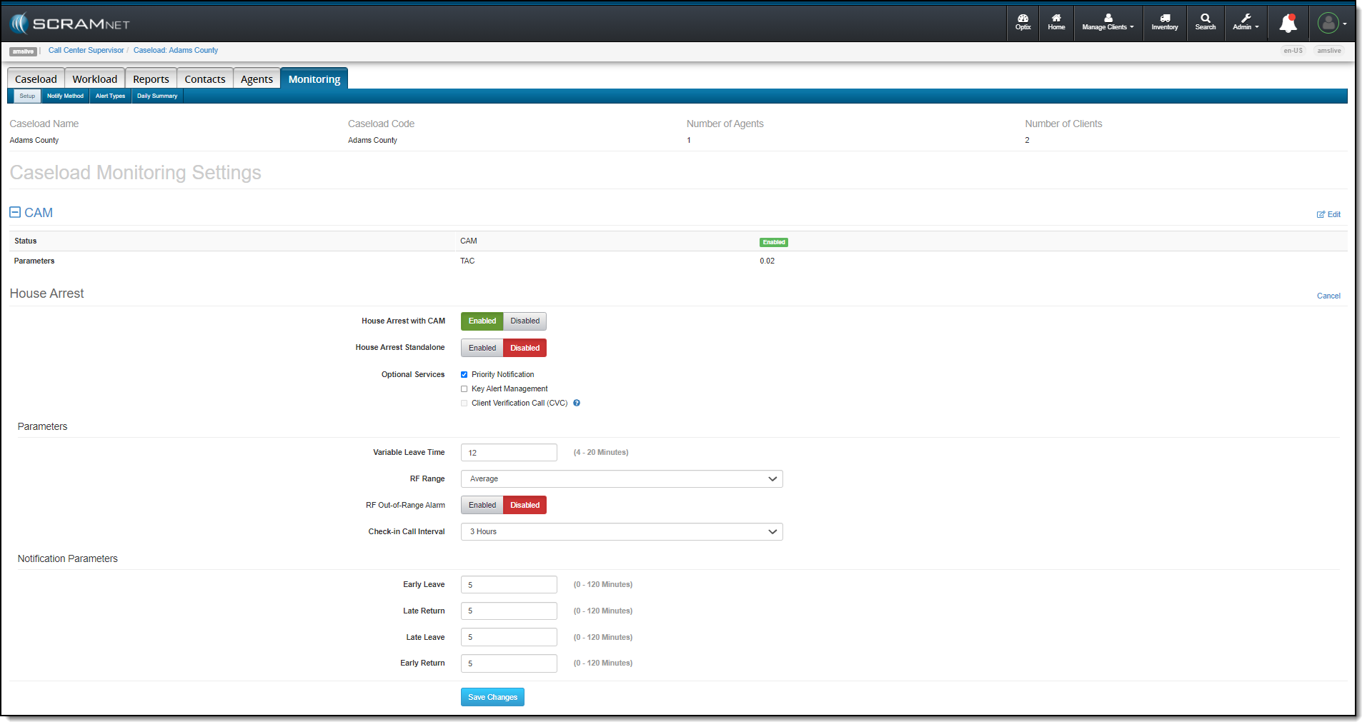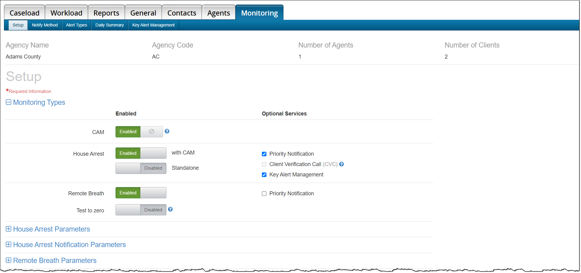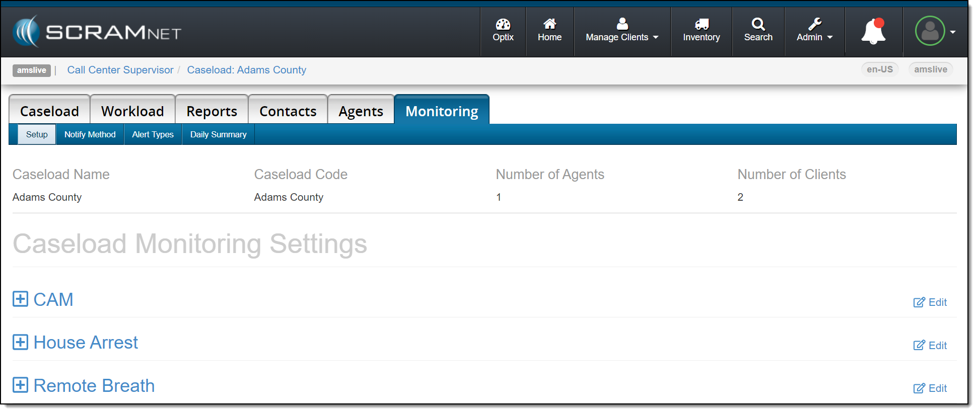 On June 10, 2021, SCRAM Systems® will be releasing an enhancement to the Monitoring tab on your Caseload page in SCRAMNET®. This enhancement updates how the monitoring types, optional services, and notification parameters selected for the caseload are displayed on the page. The functionality remains the same, the specific services and parameters are now grouped with the corresponding monitoring technology.