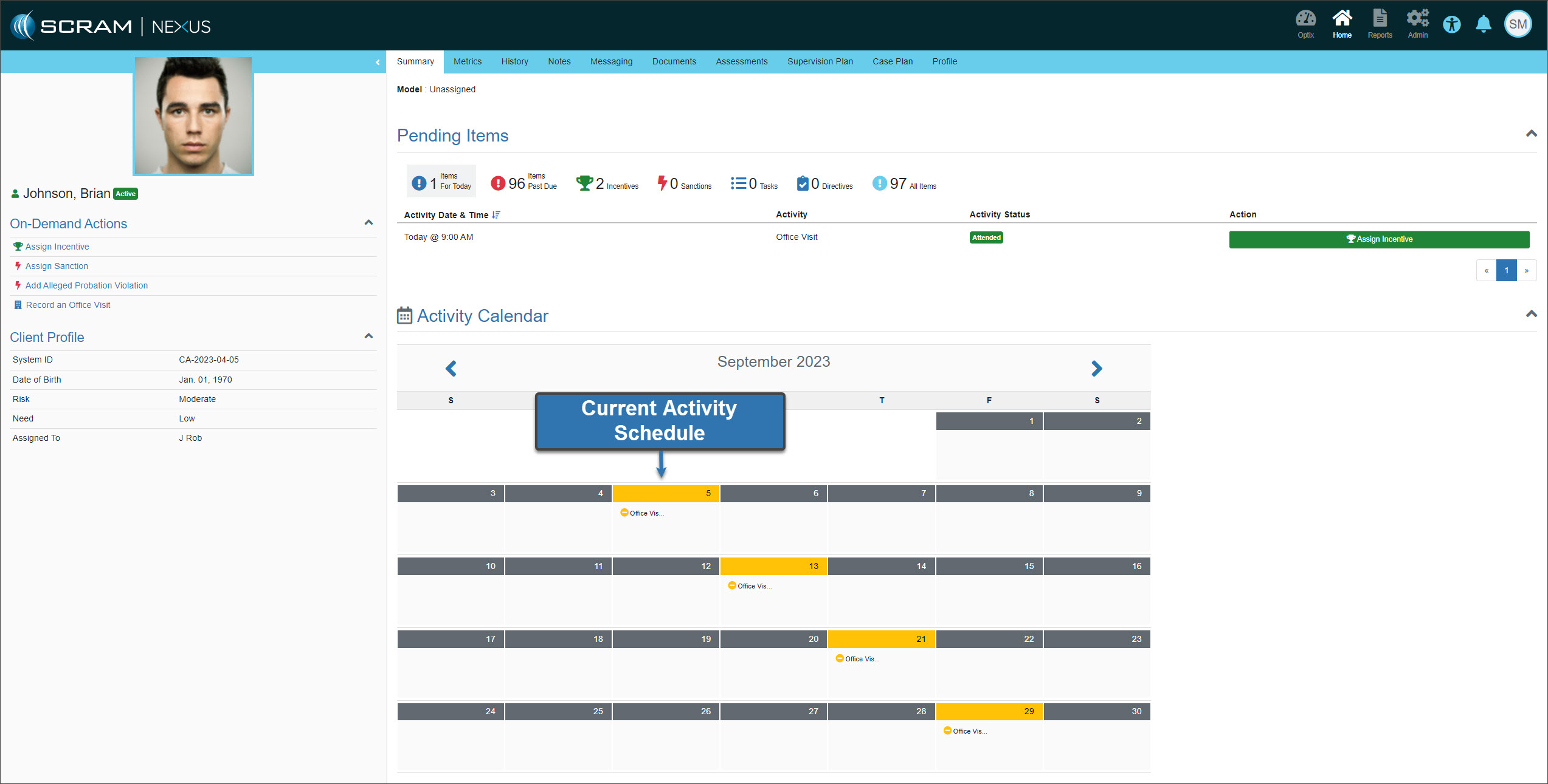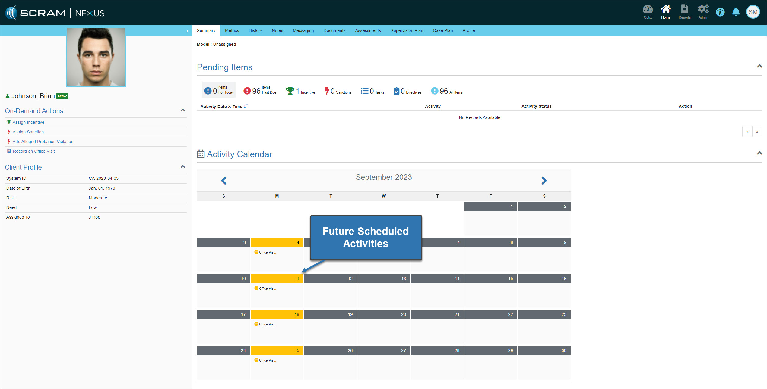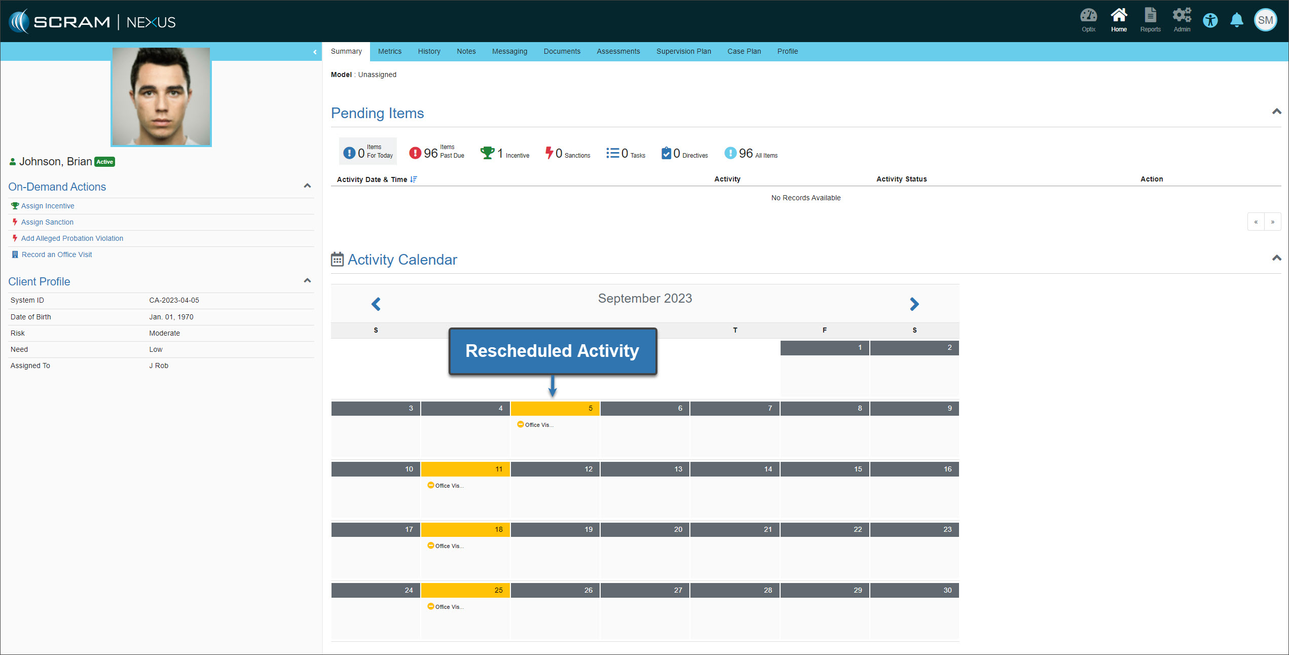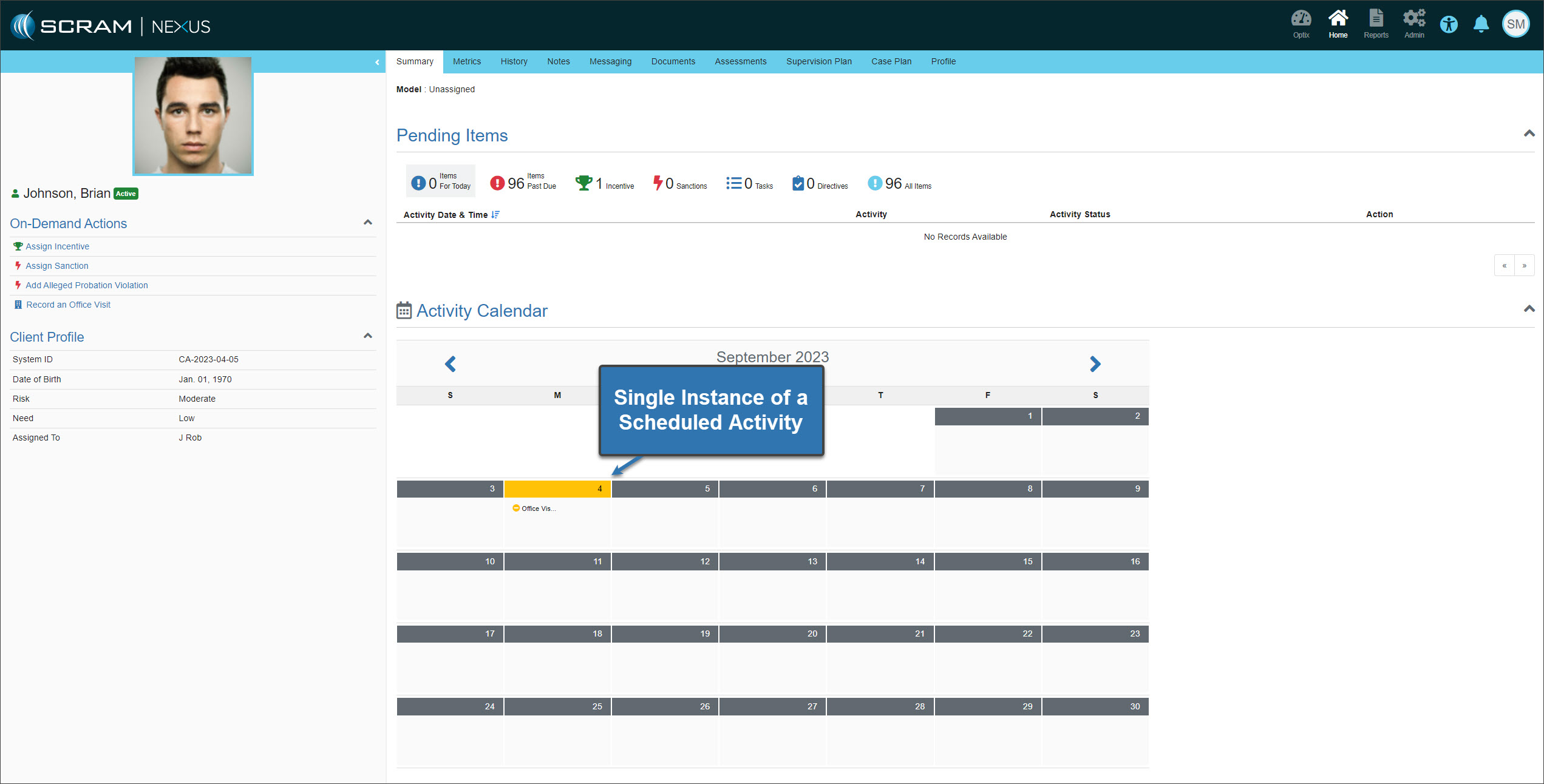 On August 31, 2023, SCRAM Systems will release an enhancement to how scheduled activities are displayed on the client’s Activity Calendar in SCRAM Nexus.