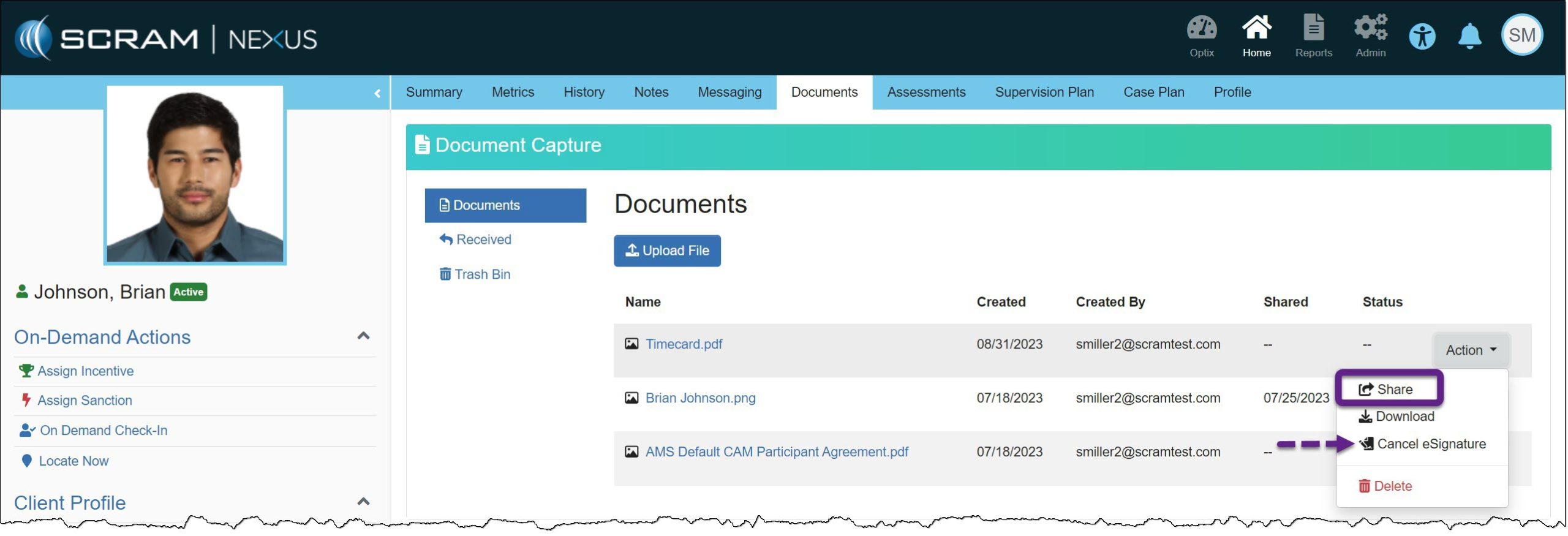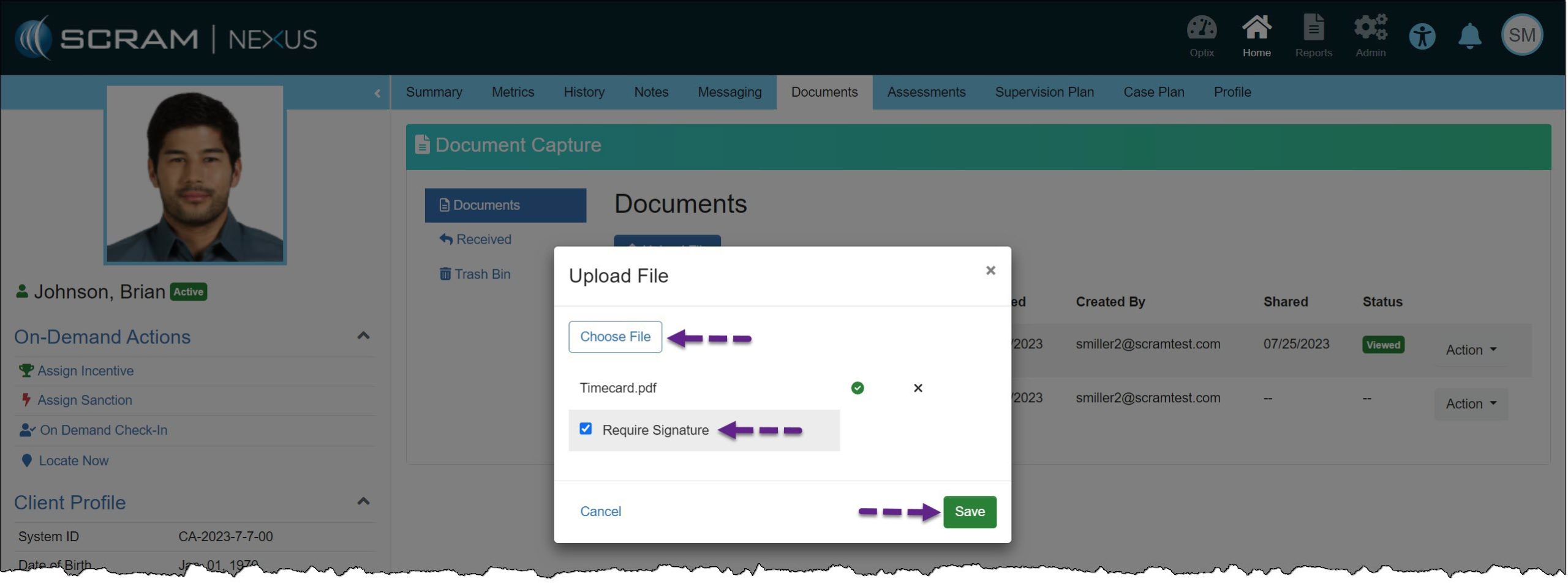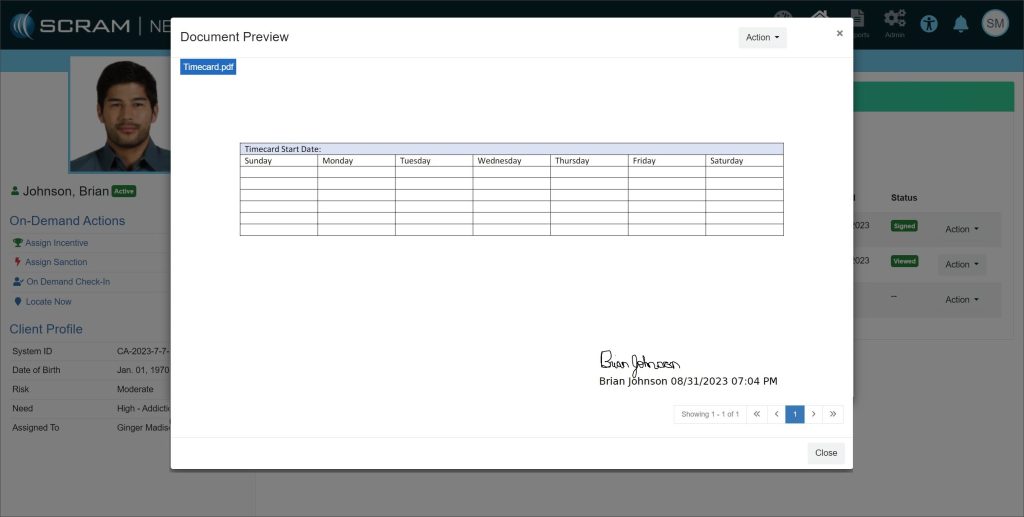 On, September 21, 2023, SCRAM Systems will release an enhancement to the SCRAM TouchPoint Documents page for your client’s supervision plan in Nexus. This enhancement enables you to require a client to electronically sign a PDF Document shared with them via their TouchPoint mobile application.