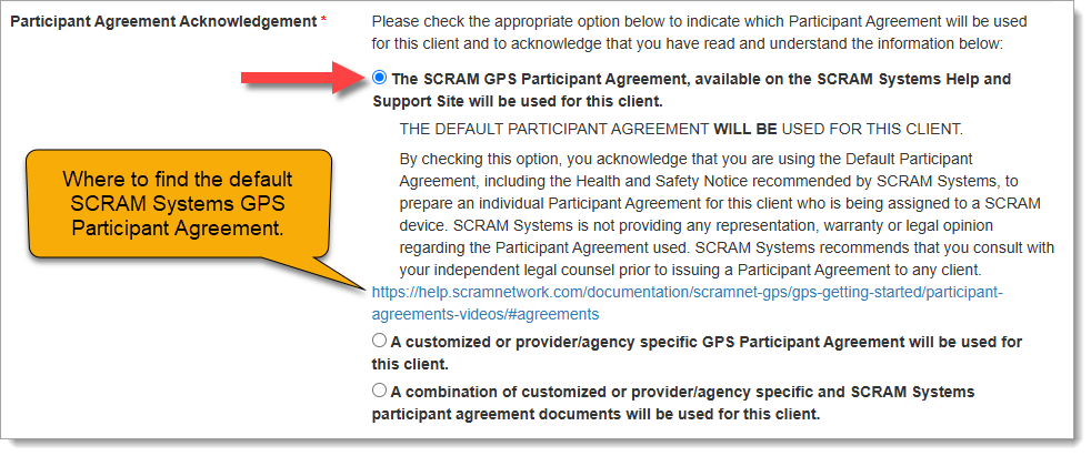 Customers who use the SCRAM Systems-provided SCRAM GPS Program Participant Agreement and Health & Safety Notice, which is available for download from SCRAM Systems Help & Support, will choose the first option, “The SCRAM GPS Participant Agreement, available on the SCRAM Systems Help and Support Site will be used for this client.” This option indicates that you are using the default SCRAM GPS Participant Agreement that was developed by SCRAM Systems and is currently available in SCRAM GPS Help.