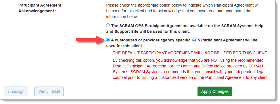Customers who use their own monitoring program participation agreements, which they have developed in-house, independent of SCRAM Systems, and are NOT accessed from SCRAM Systems Help & Support, should choose the second option, “A customized or provider/agency specific GPS Participant Agreement will be used for this client,” as shown below:
