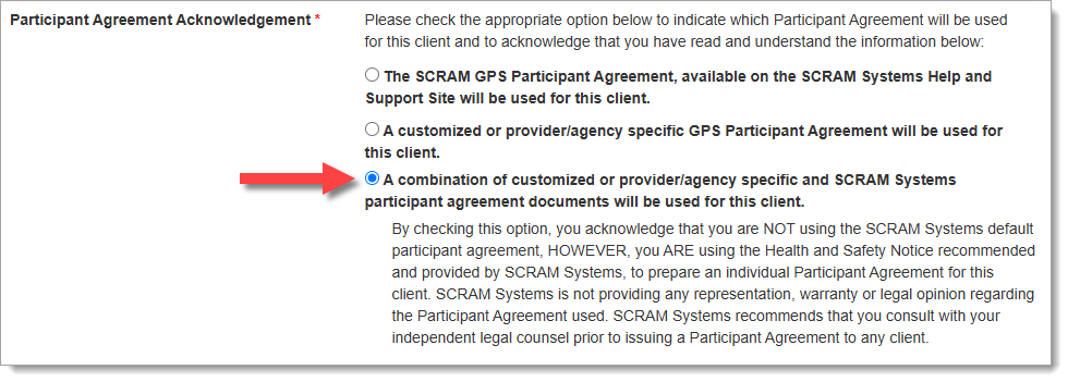 Customers who use their own monitoring program participation agreements, which they have developed in-house and independent of SCRAM Systems, but combine it with the SCRAM Systems Health & Safety Notice, should select the third Participant Agreement Acknowledgement option.