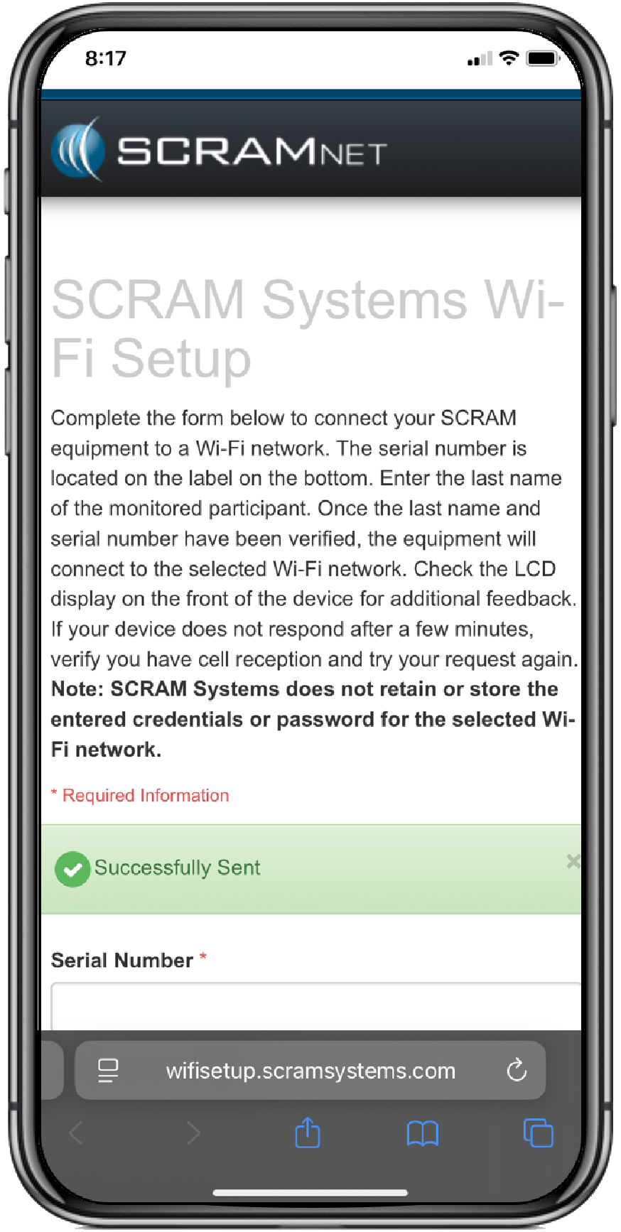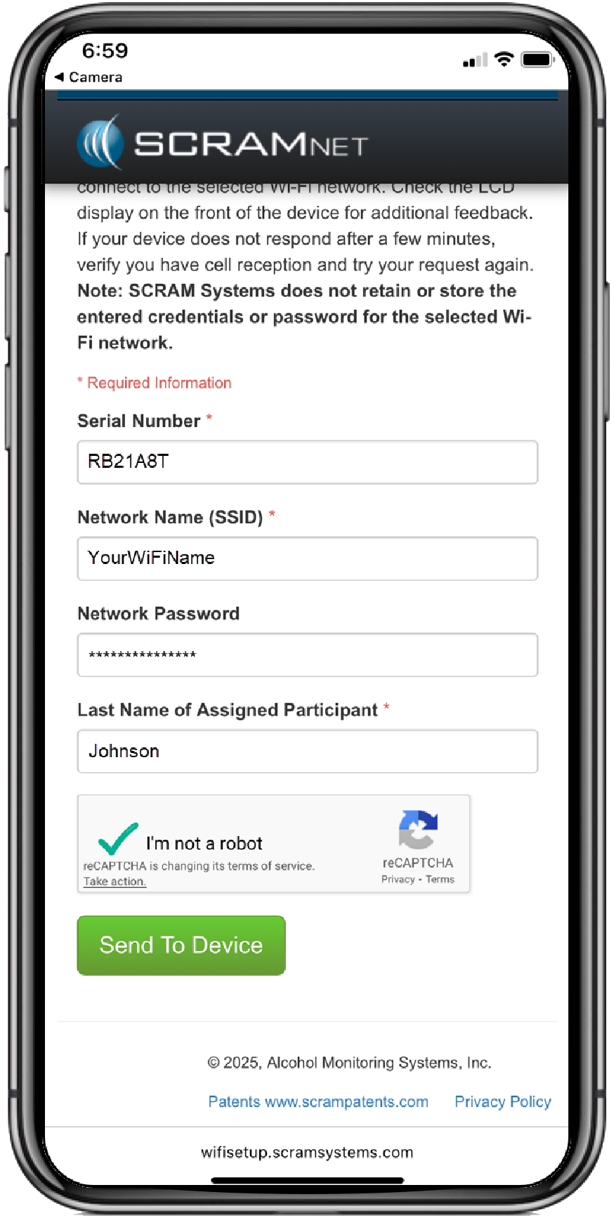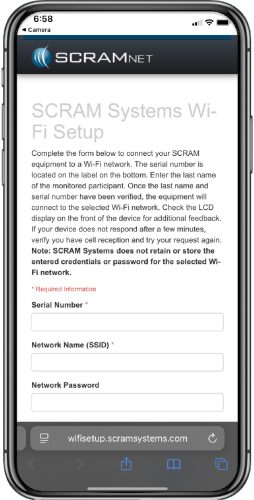 An internet page for SCRAM System Wi-Fi Setup will open on the smartphone. Enter the required information and complete the captcha requirement.