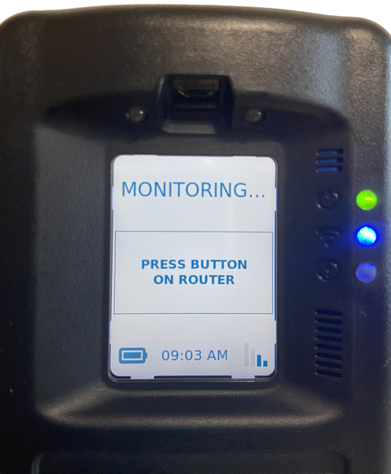 The “Press Button on Router” screen will remain for approximately two (2) minutes. After which, the screen will update to Monitoring, and the device will go into “sleep” mode.