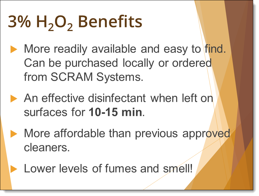 When used correctly and allowed to remain on surfaces for 10-15 minutes, 3% Hydrogen Peroxide solution is an effective disinfectant, but without the harsh fumes or smell associated with the previous selection of disinfectants. For this reason, 3% Hydrogen Peroxide solution is now the only cleaner approved by SCRAM Systems.