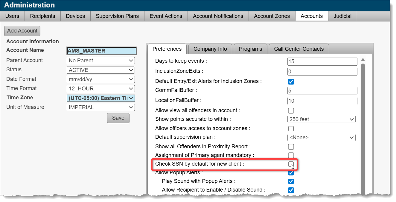With this release, Administrators may select a checkbox at the account level that ensures that all new clients added will have the SSN checkbox enabled. Enabling this checkbox encrypts the social security number of the client in reports and provides an additional level of protection for that information.