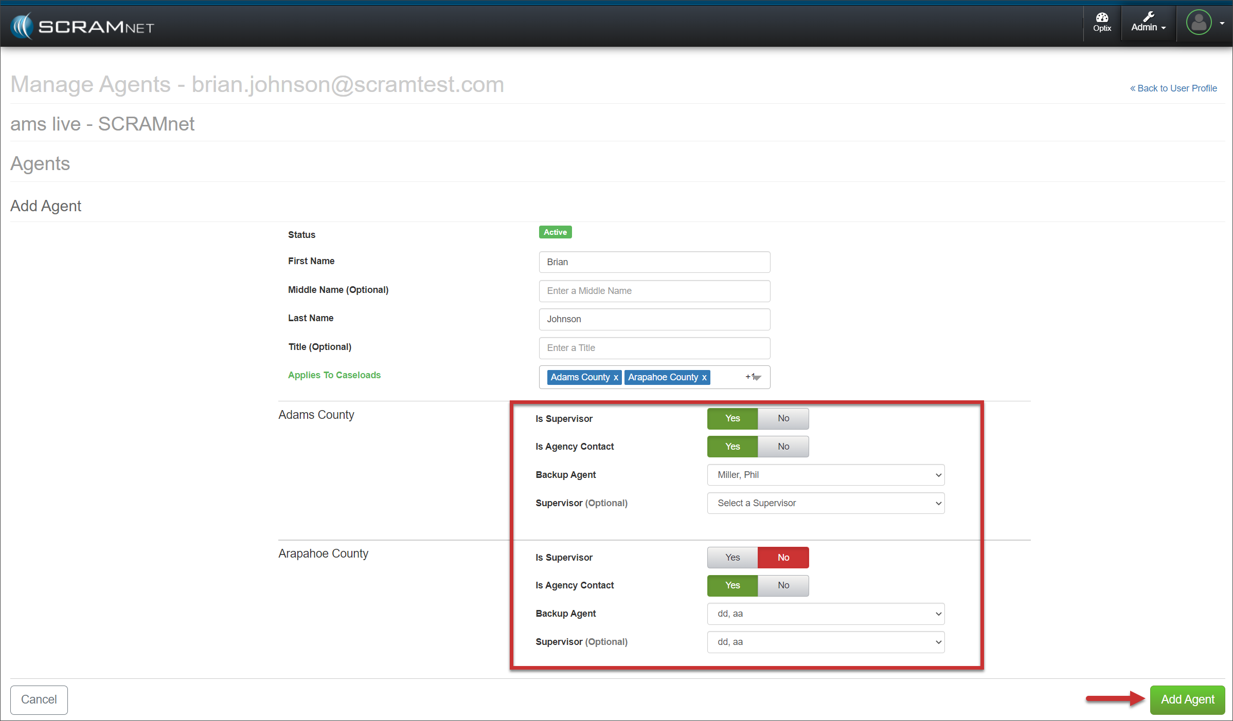 As an Administrator with “Manage User” or Manage Caseloads” permissions, once the user’s profile has been created, you may add them as an Agent, as well as add their Priority Notification and Daily Summary Report delivery methods to one or more caseloads from the user’s Profile page.