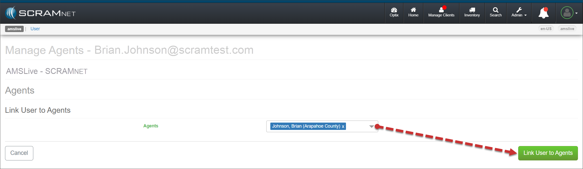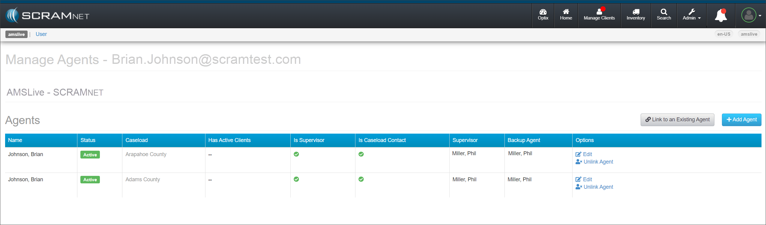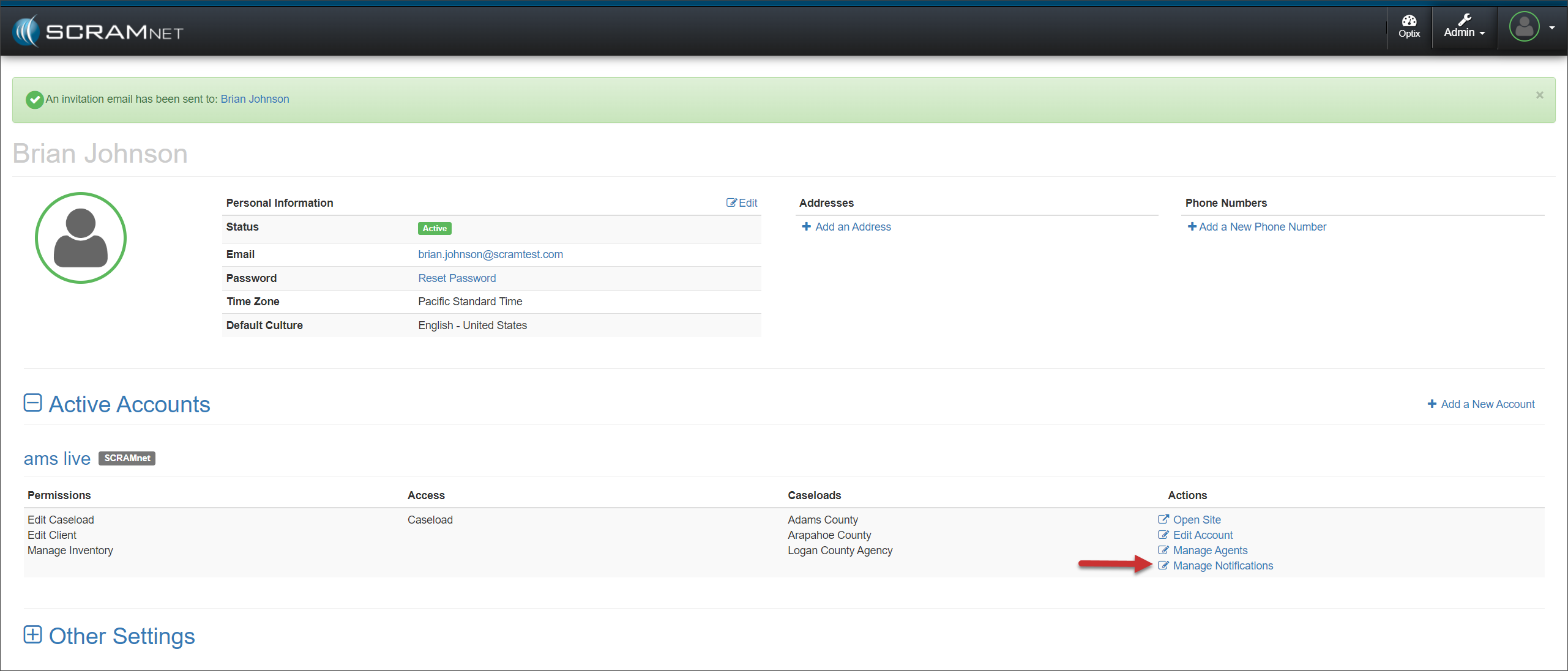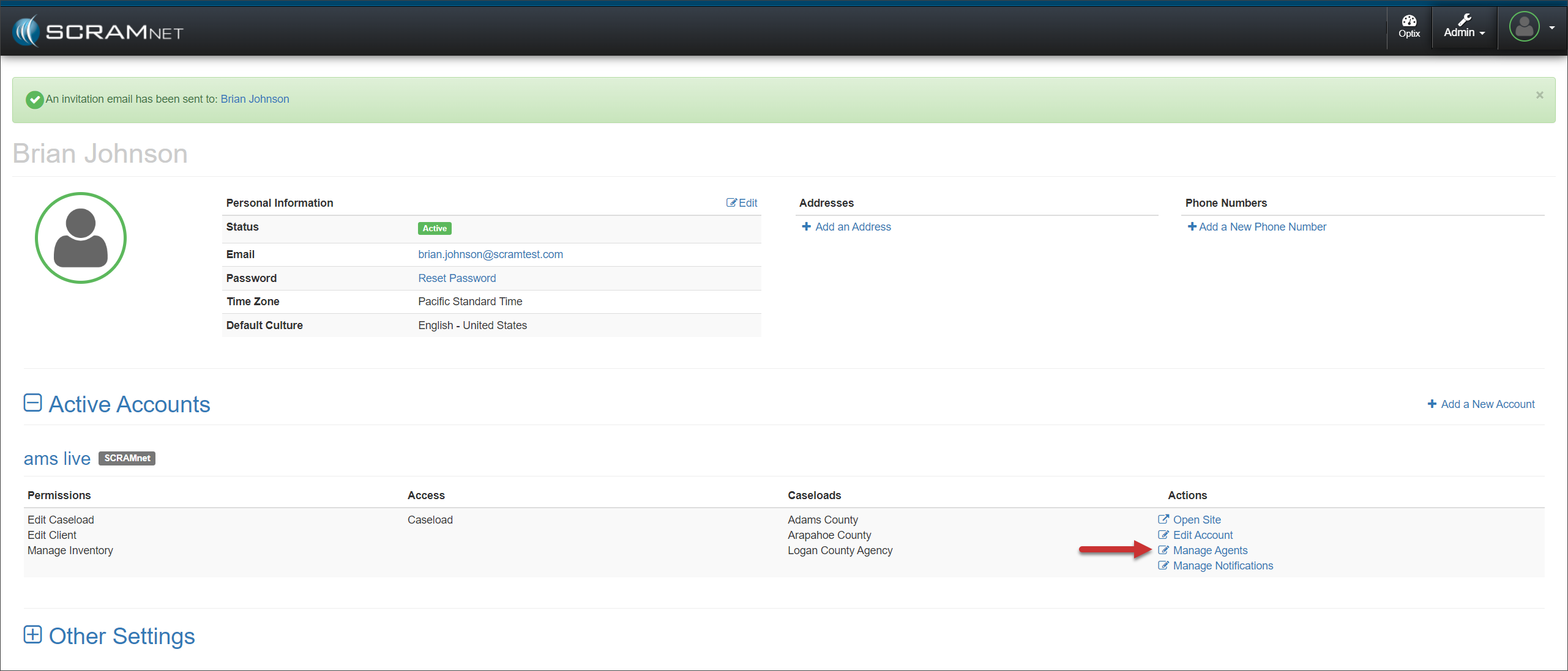 Once you have created the new user from the Manage Users page, access the user’s Profile page to locate their SCRAMNET Active Account settings; then select the Manage Agents hyperlink found under the “Actions” column.