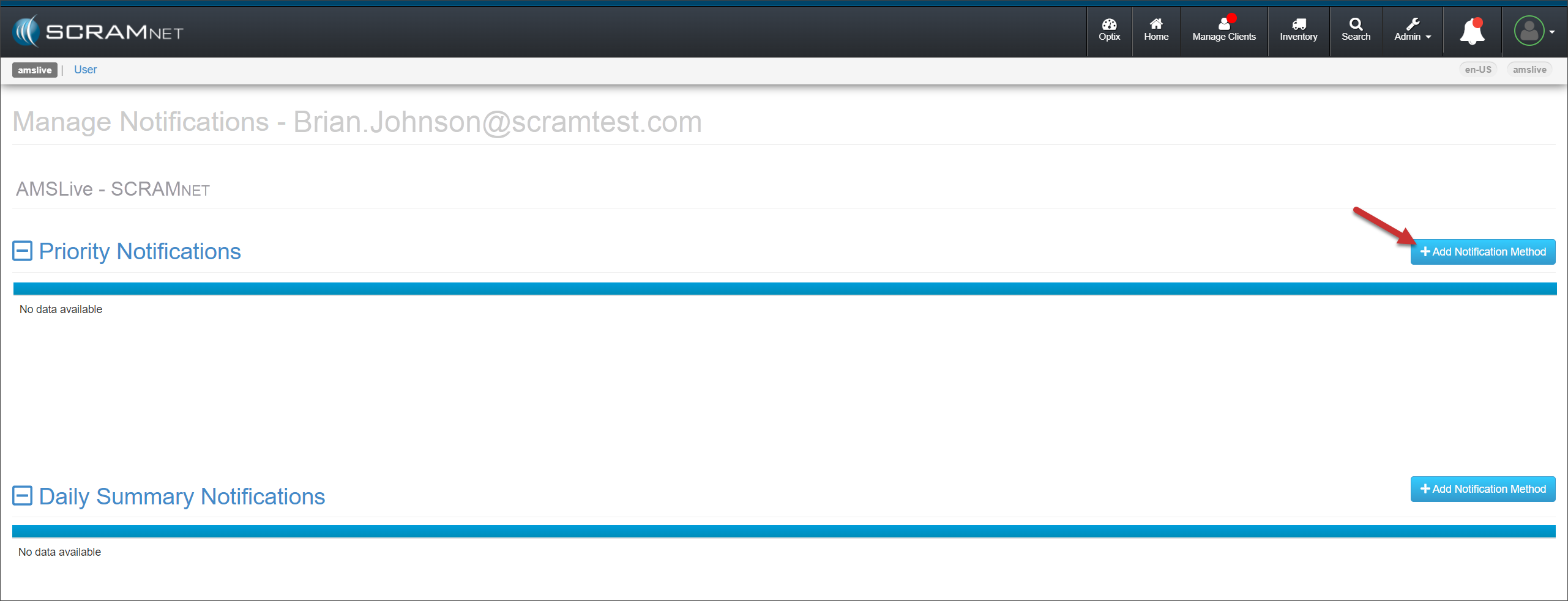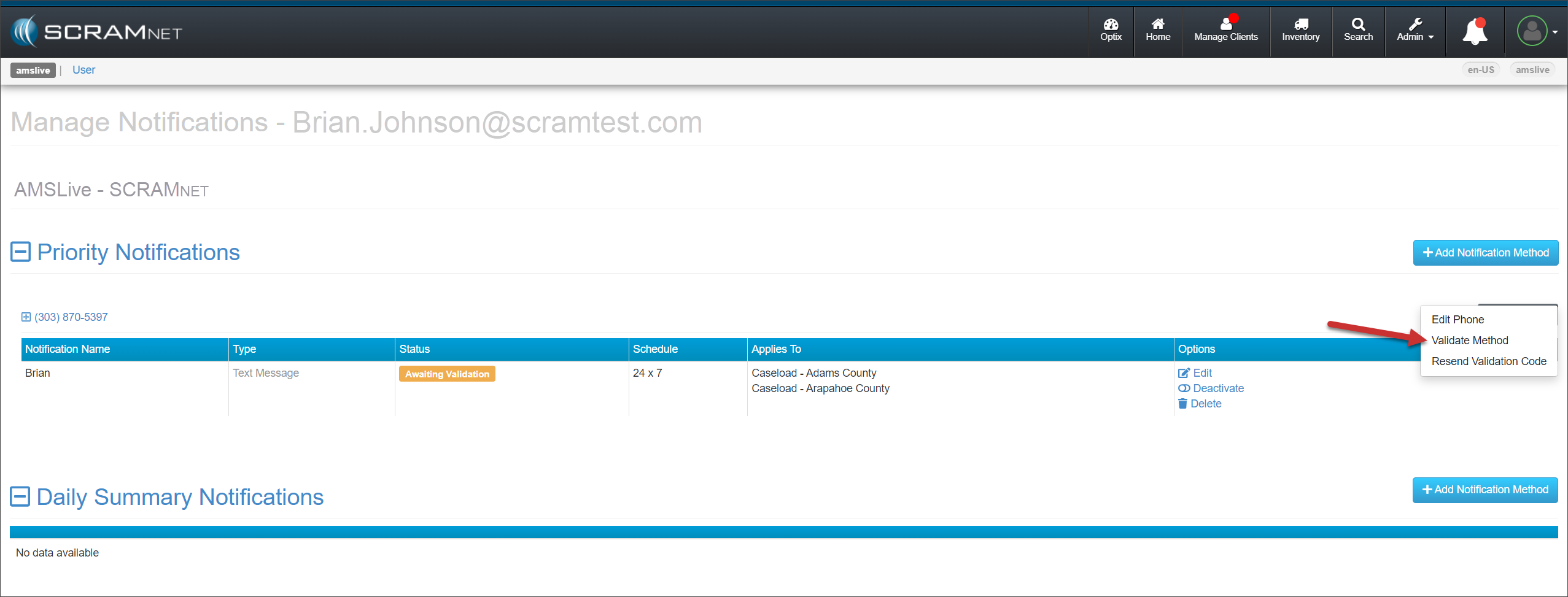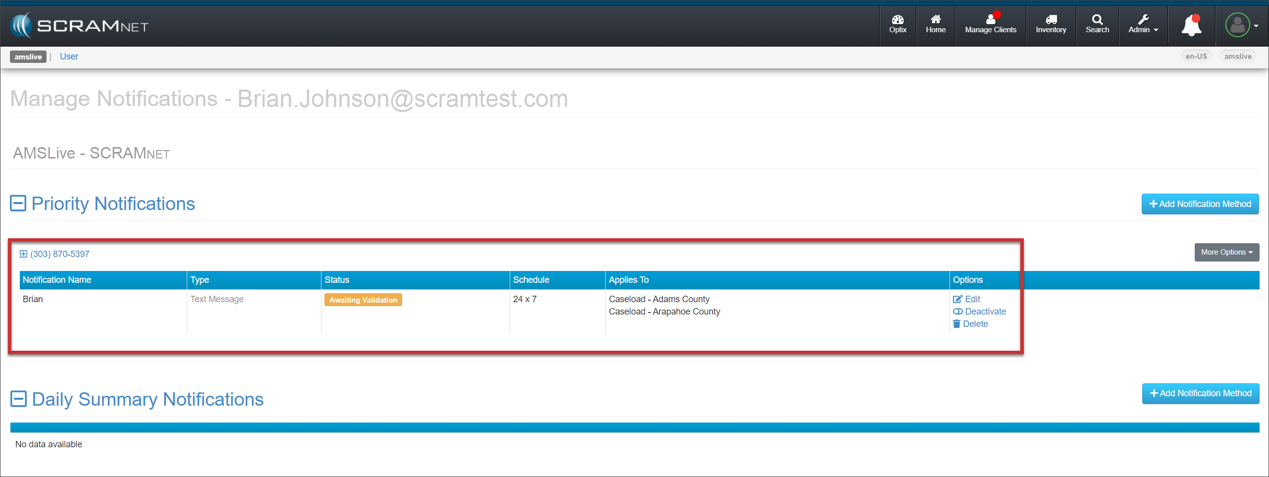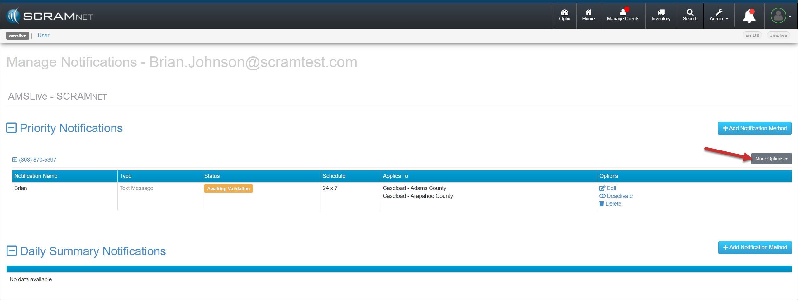 Select the Manage Notifications hyperlink under the Actions column for their SCRAMNET account.