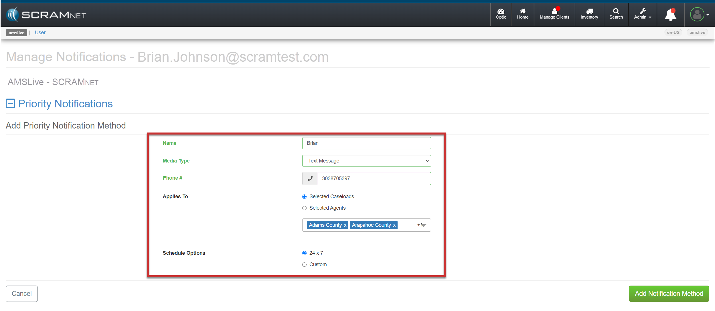 Select the Add Notification Method button to save the information and send the Validation Code via the Media Type selected. The notification method is displayed on the page with each Caseload associated with that notification method.