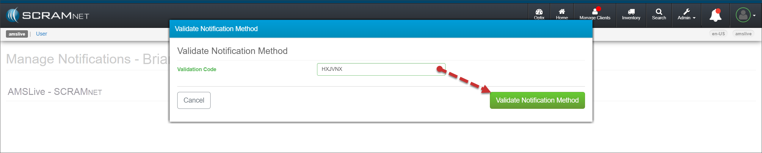Enter the Validation Code you sent to them via the Media Type you selected, and then select the ValidateNotification Method button.