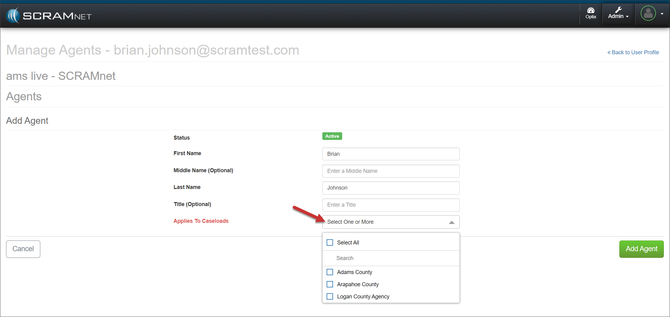 Select the one or more Caseloads in which the user will be an Agent from the Select one or More dropdown menu.