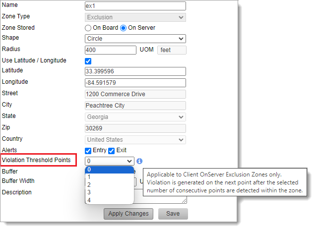 For OnServer Exclusion Zones, set the number of Violation Threshold Points to allow up to four location points inside the zone before generating the violation. The violation will be generated on the subsequent (fifth, e.g.) point.