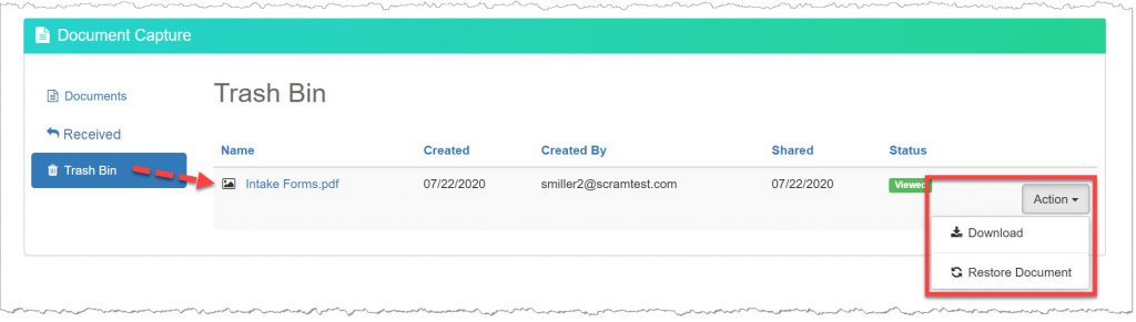 The Trash Bin page displays all images and documents deleted from either the Documents page or the Received page. The Action menu to the right of each image allows you to restore or download the image or document from the system.