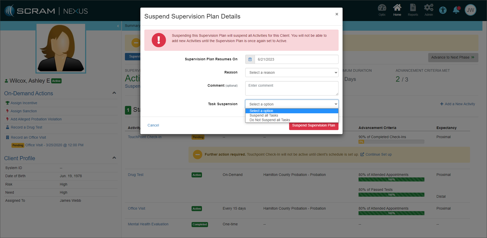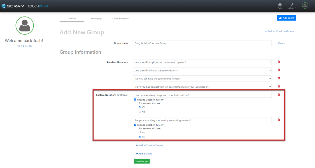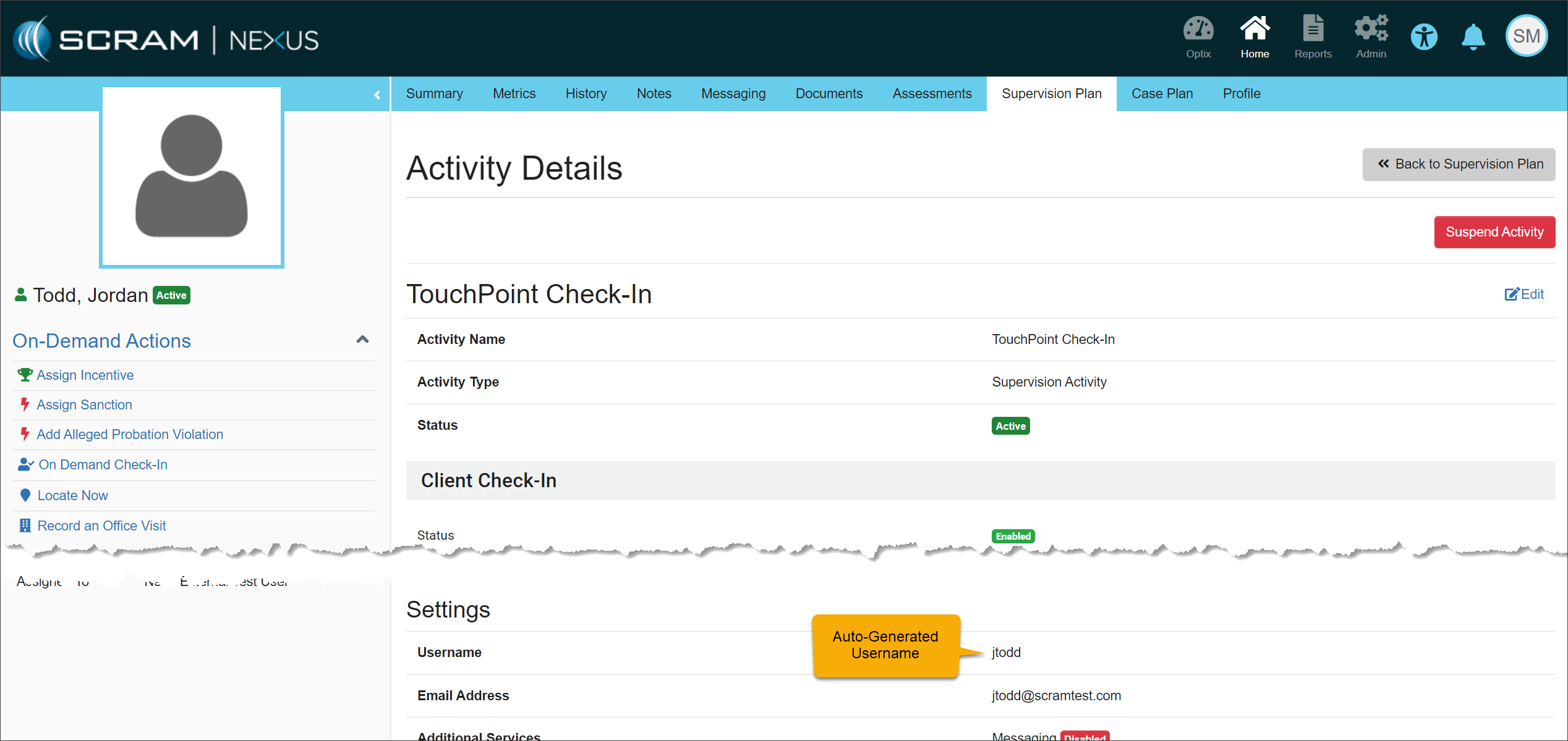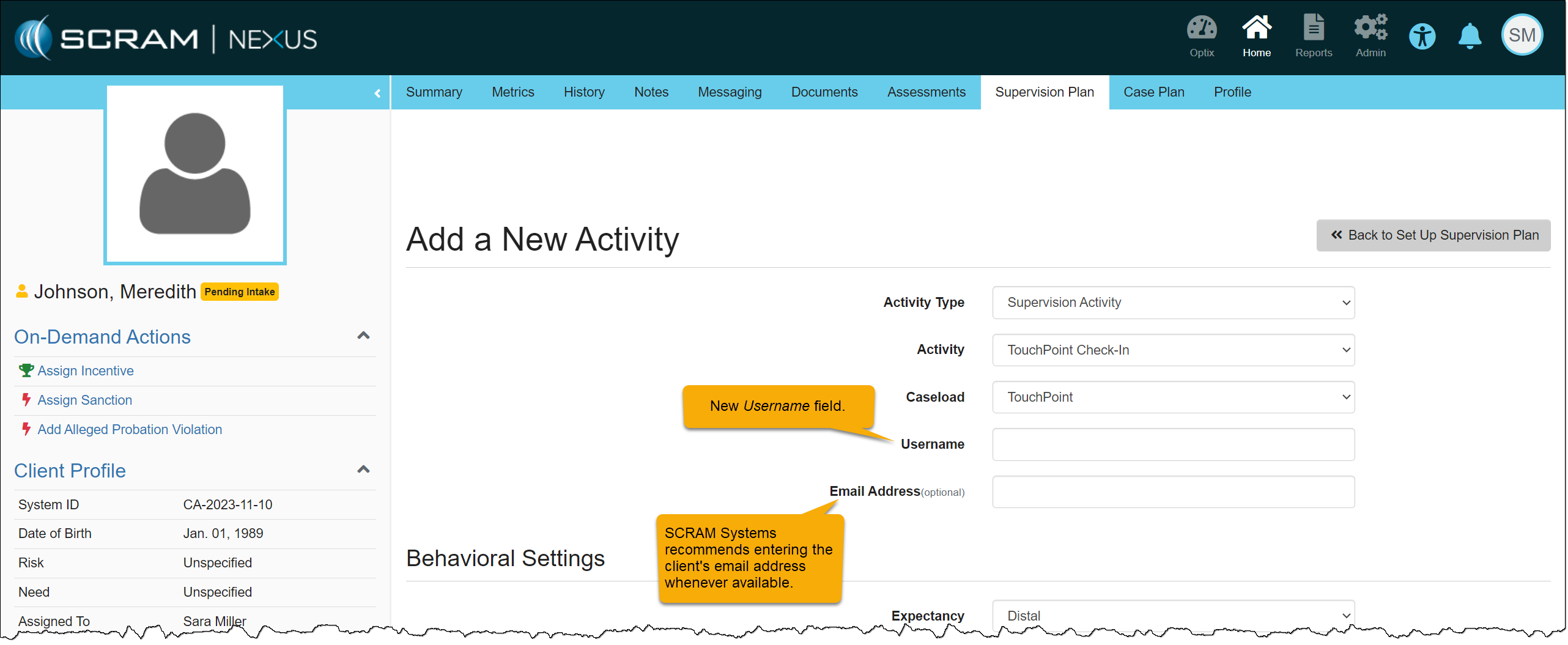 On, October 18, 2023, SCRAM Systems will release an enhancement to the SCRAM TouchPoint application username requirement for your client’s supervision plan. This enhancement enables you to create a unique username for the client to access the application instead of requiring an email address. This enhancement is helpful when a client’s supervision plan includes a restriction from using email or accessing the internet.