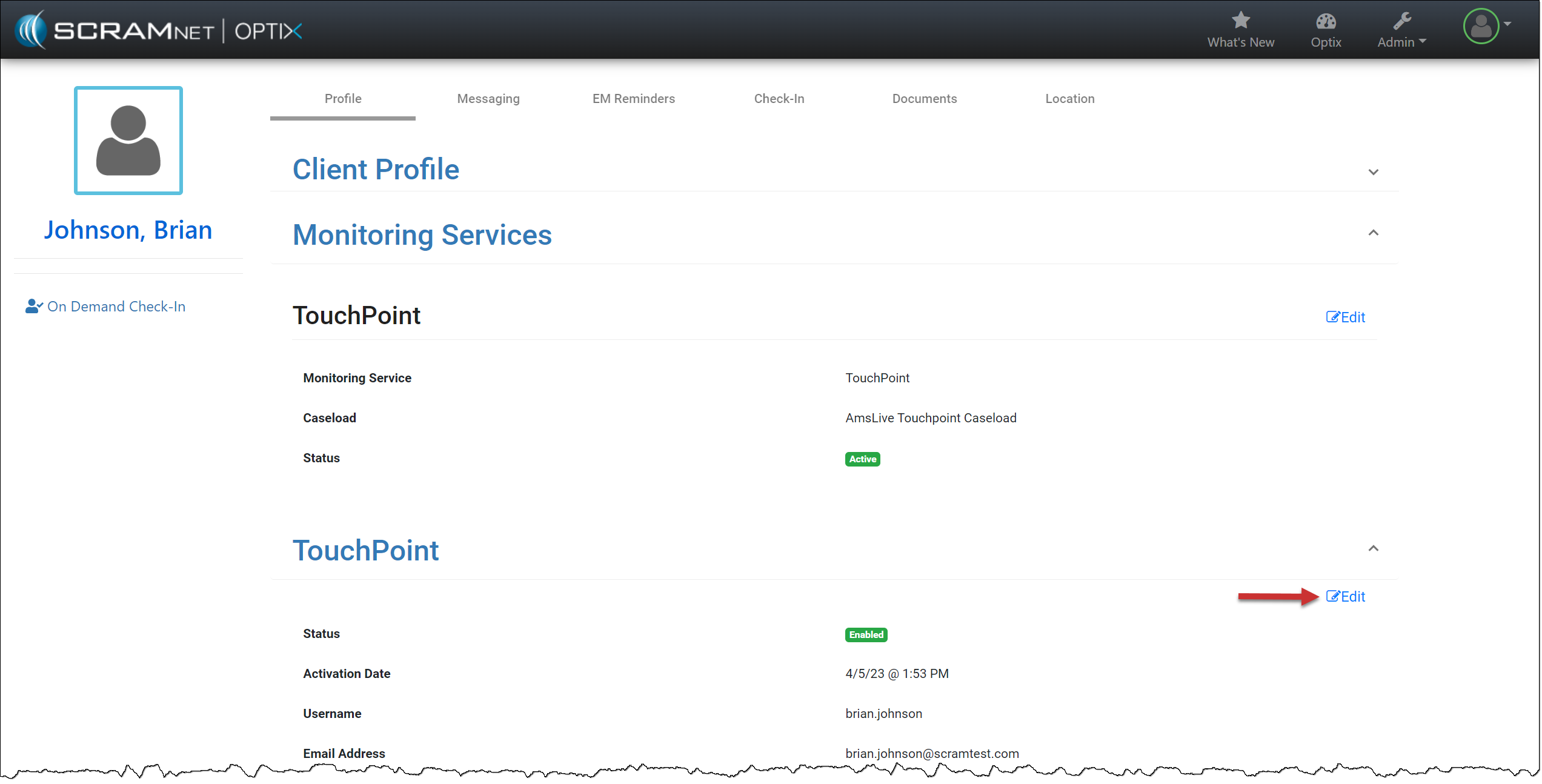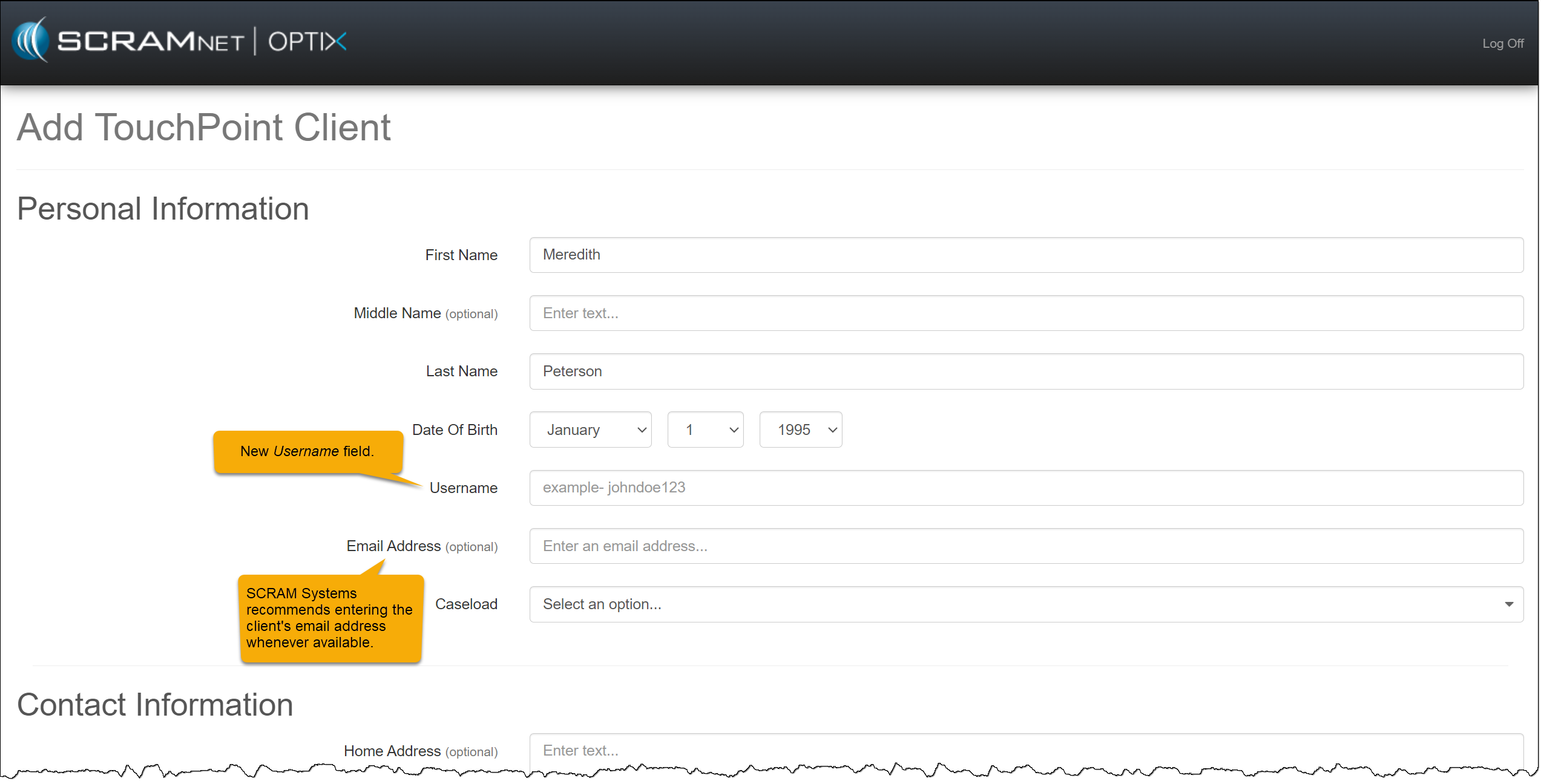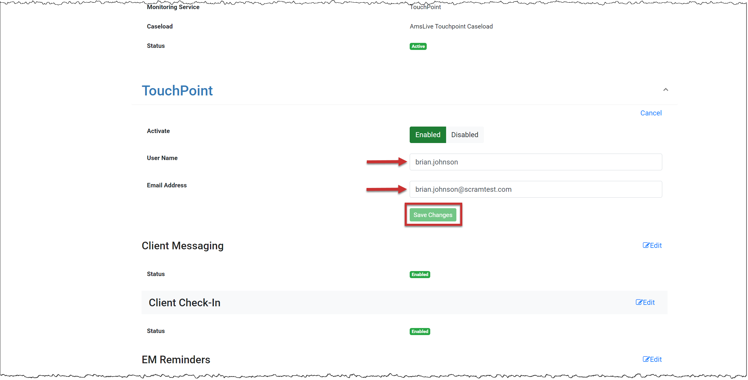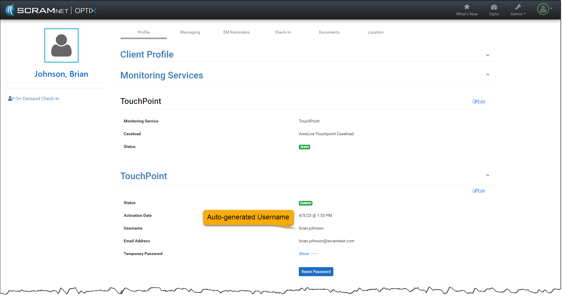 You do not need to take any actions for your current active TouchPoint client caseloads. Your clients may continue to log in using their email addresses. In the system, you will notice that SCRAM Systems has auto-generated the username field for each TouchPoint client.