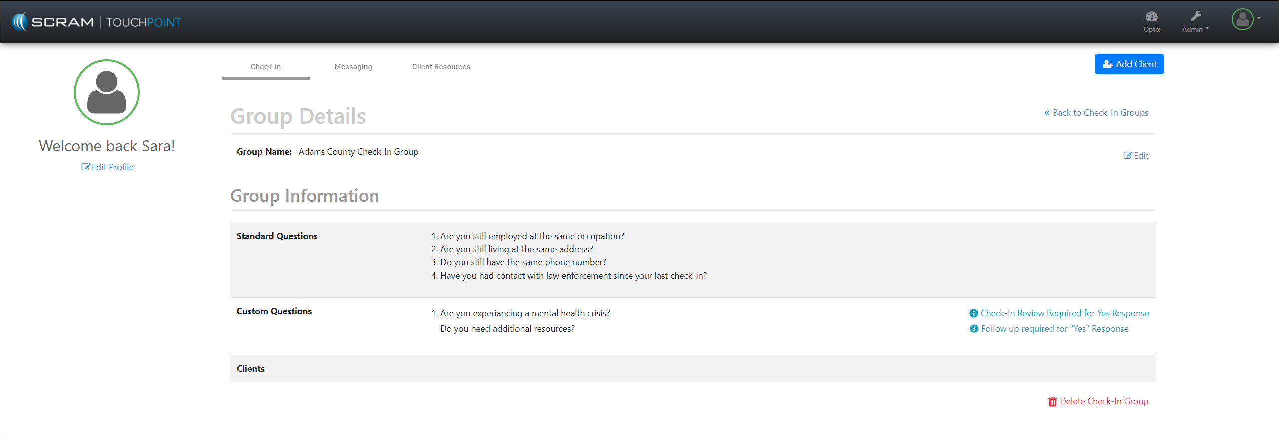 ![]() | SCRAM Systems recommends entering the client’s email address in the Email Address (optional) field whenever possible. This will ensure the client may complete a password reset independently within the TouchPoint application when needed. |