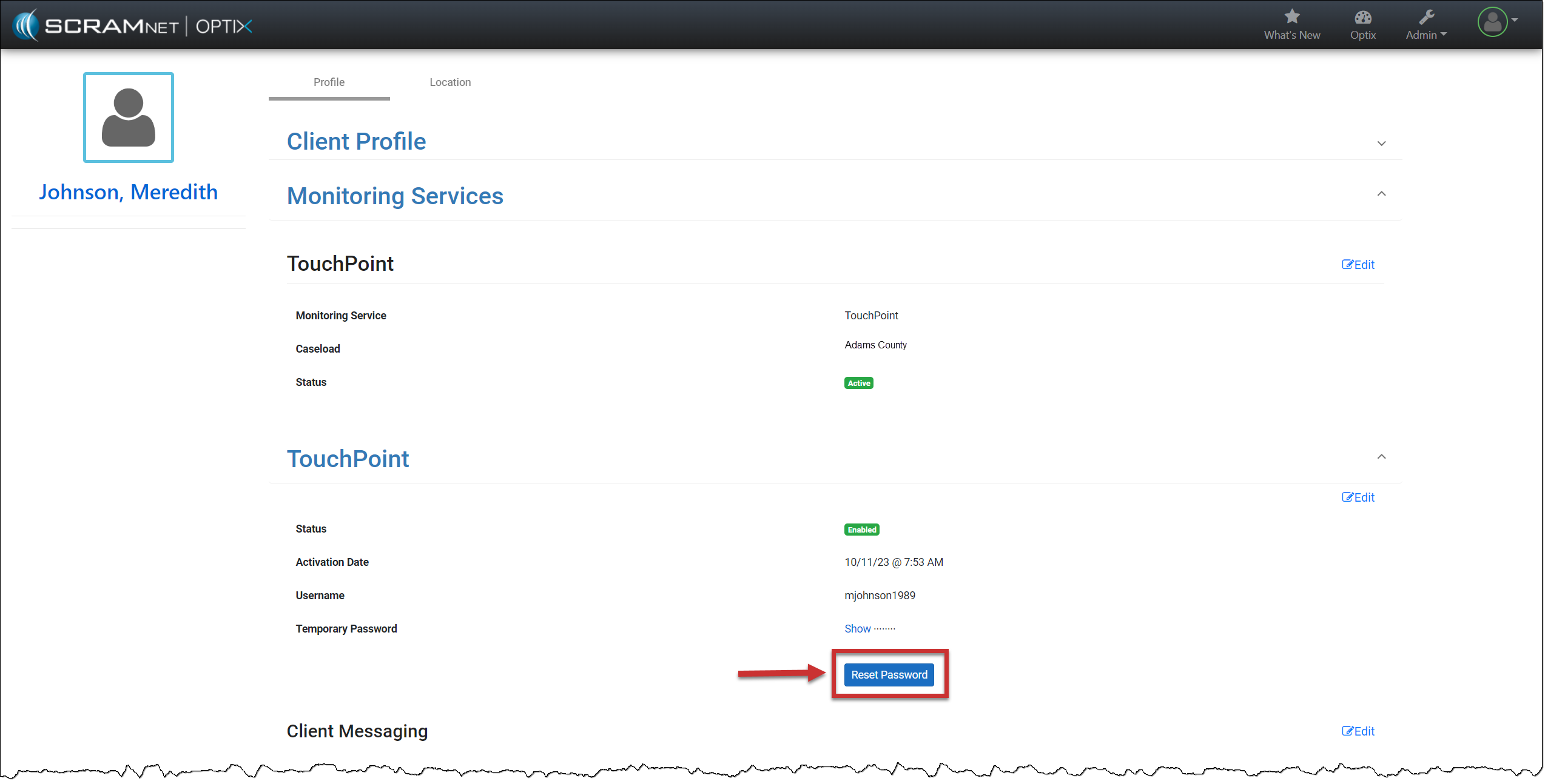 When an email is not listed for the client in the Email Address (optional) field, the client is instructed to contact the supervising authority when a password reset is needed. As the supervising authority, you must access the client’s TouchPoint profile in the system and create a new password for the client to use.