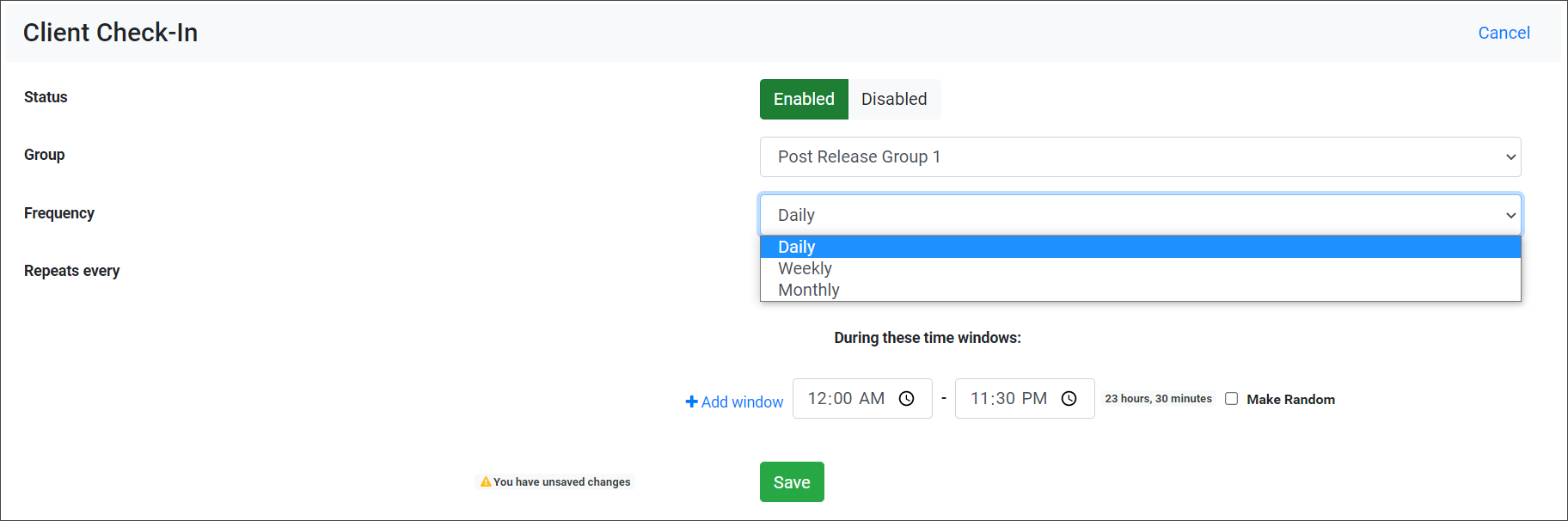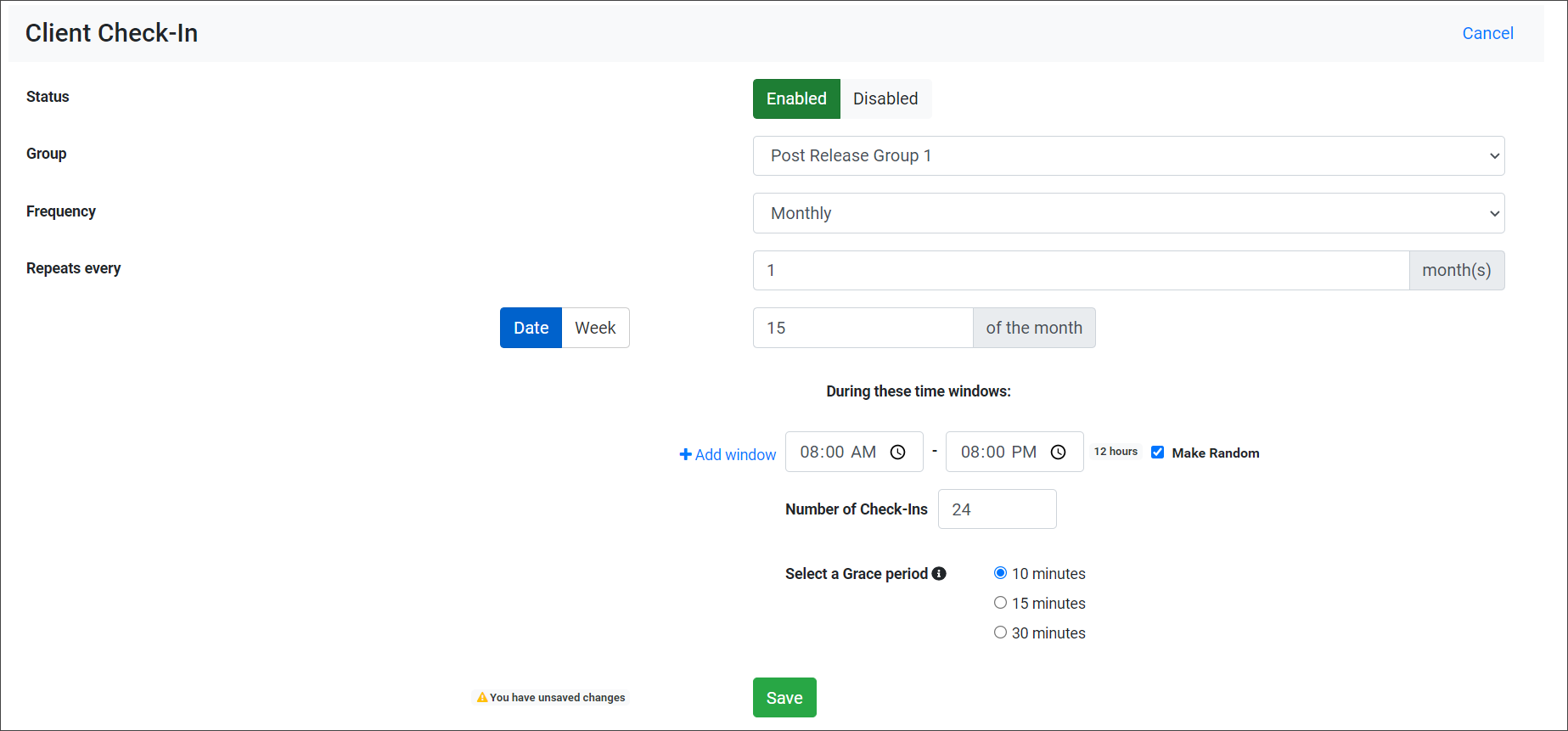 - To add multiple check-ins during a check-in window, select the Make Random checkbox. You will then set the number of check-ins the client must complete during the window and the Grace Period the client has to complete each check-in when prompted. There is a maximum number of random check-ins allowed during each window. This calculation is based on 30-minute intervals plus the grace period. An error message will display if you try to enter more check-ins than allowed during a window.