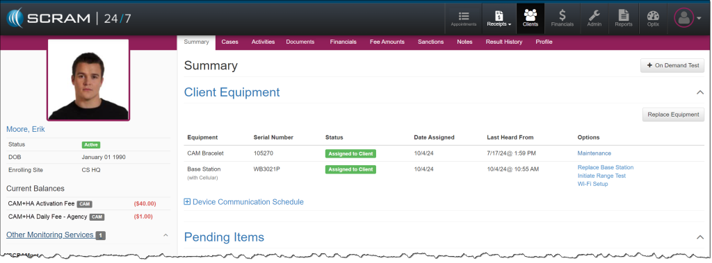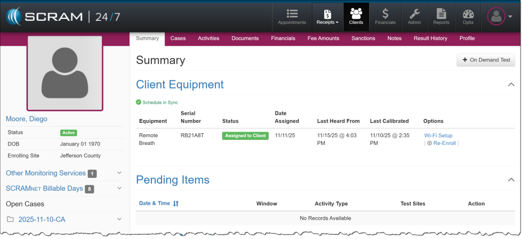 On January 14th, 2026, from 11:00 AM to Noon MST, SCRAM Systems will release two enhancements in SCRAM 24/7. The first enhancement improves client search capabilities. The second allows you to perform additional equipment actions directly from the Options column on the client’s Summary page for your CAM+HA and RB Activity clients when equipment is assigned.