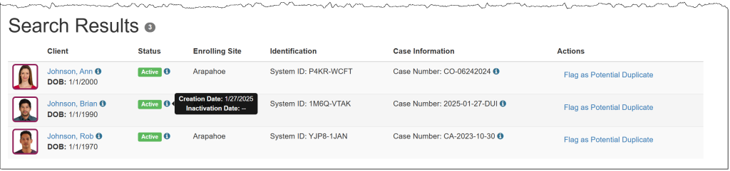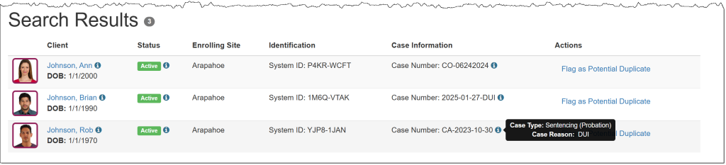 A new Case Information column displays the client’s case number, along with an information icon that shows the case type and case reason when hovered over.