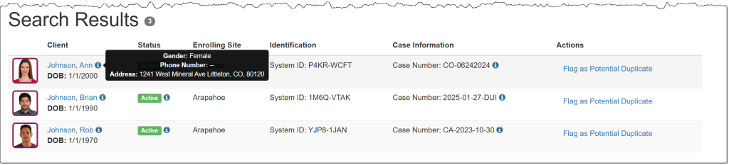 The client’s Date of Birth is now located under their name hyperlink, along with an information icon that displays the client’s gender, phone number, and address when you hover your mouse pointer over it.
