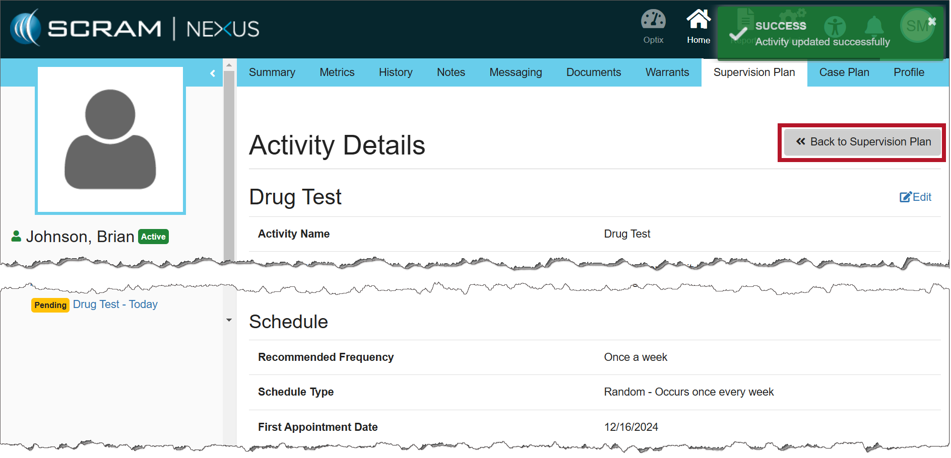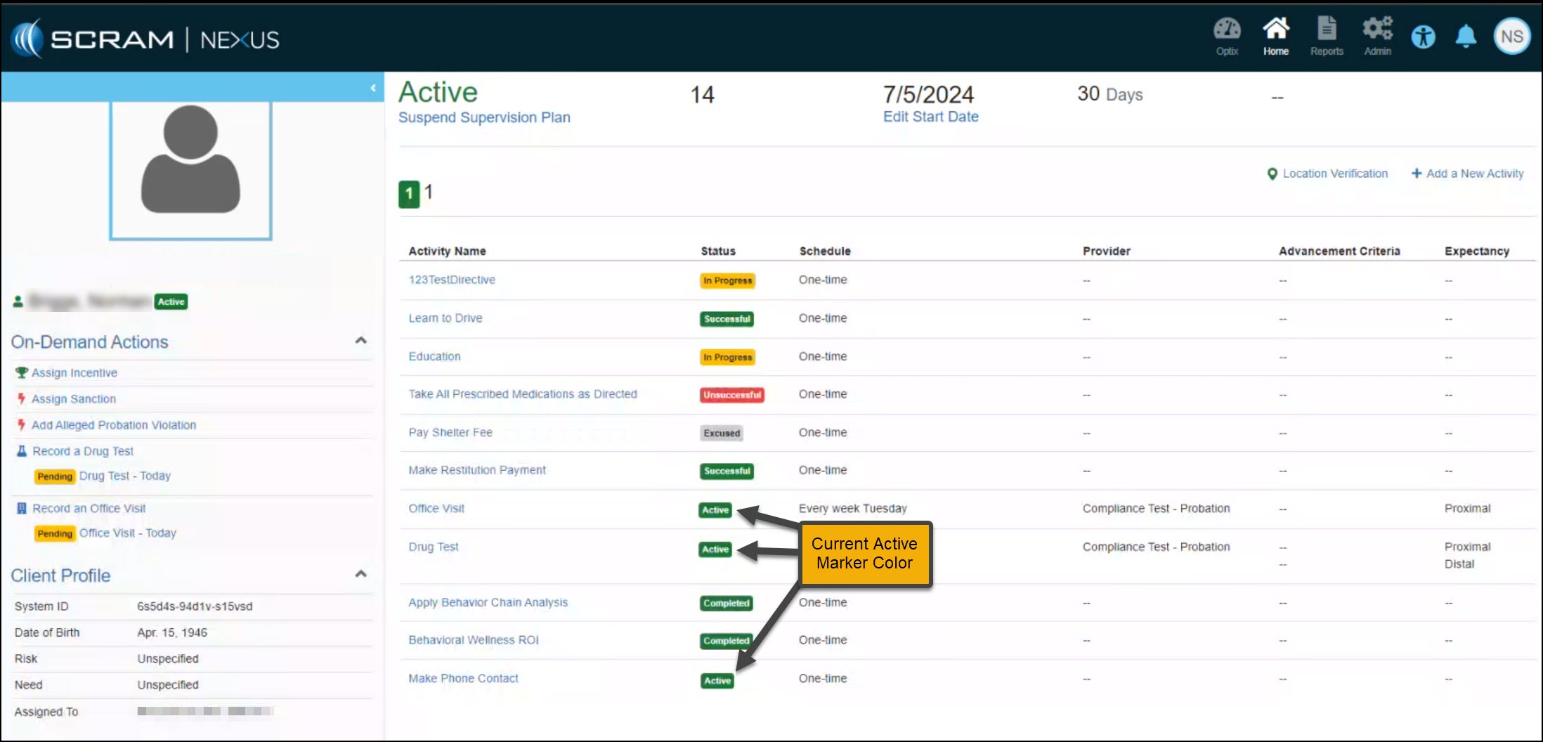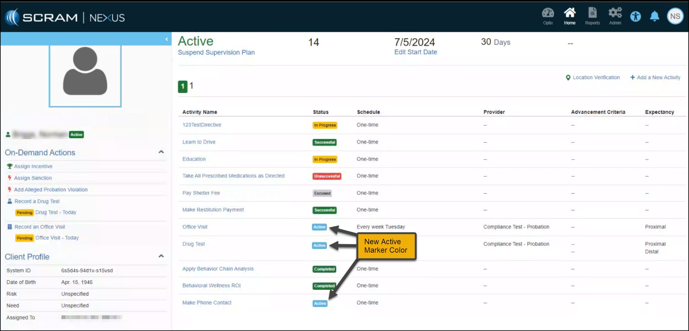 On July 25, 2024, SCRAM Systems will release an enhancement to help you identify the Active, Successful, and Completed status markers for Activities within a Supervision plan. Currently, all three (3) status markers are green. With this enhancement, the Active marker will now be light blue.