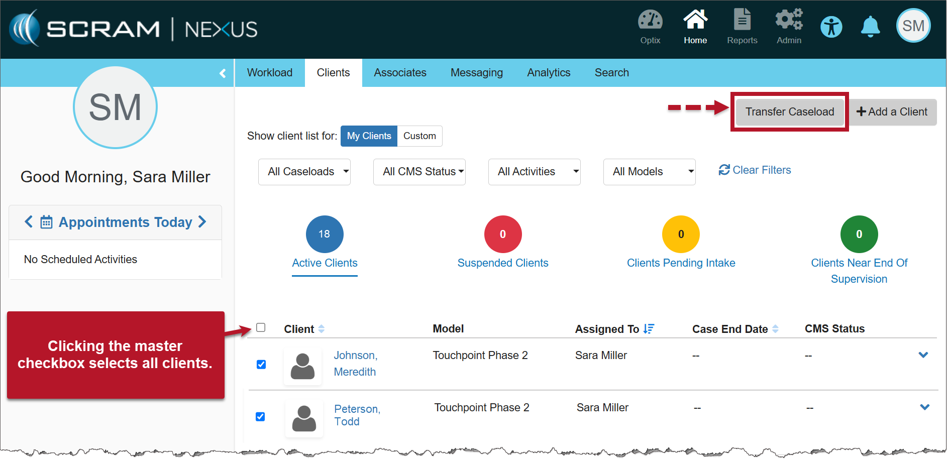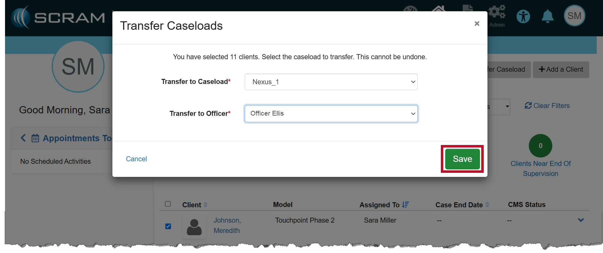 The first enhancement available is SCRAM Nexus Mass Transfer. Once enabled, you may transfer a caseload or multiple clients in bulk to other officers or caseloads.