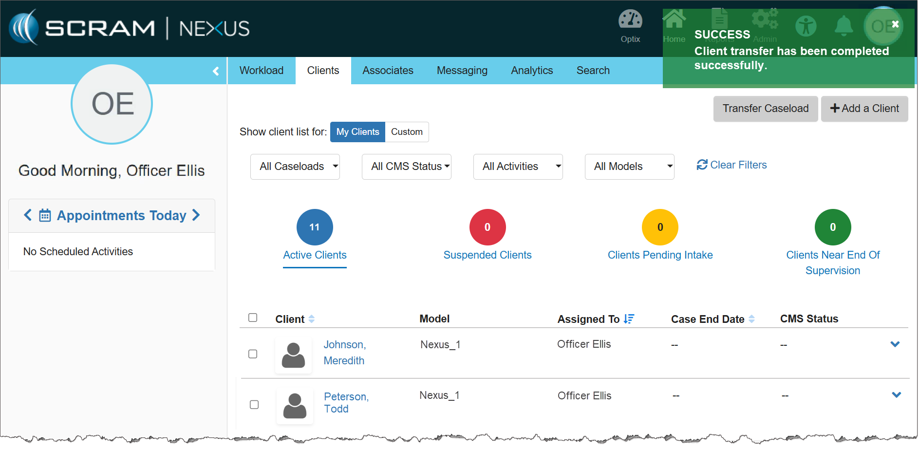 Once saved, a success pop-up banner will display. Additionally, the clients will be displayed on the transferred officer’s Clients page.