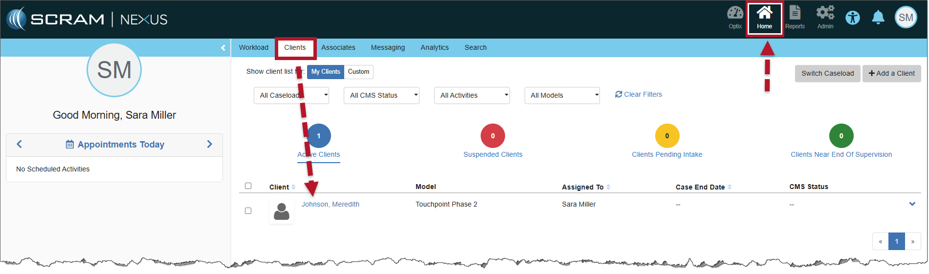 Select the client’s name hyperlink from the Clients tab on the Home page.