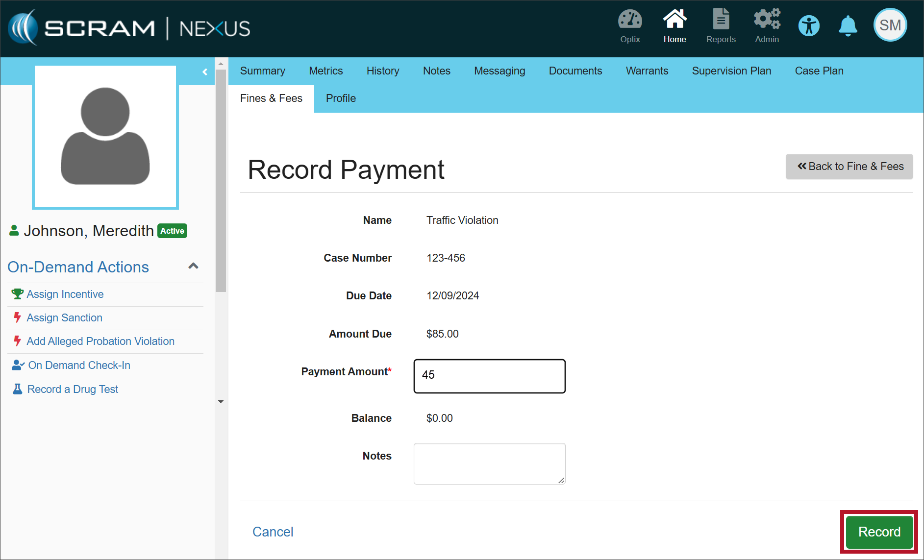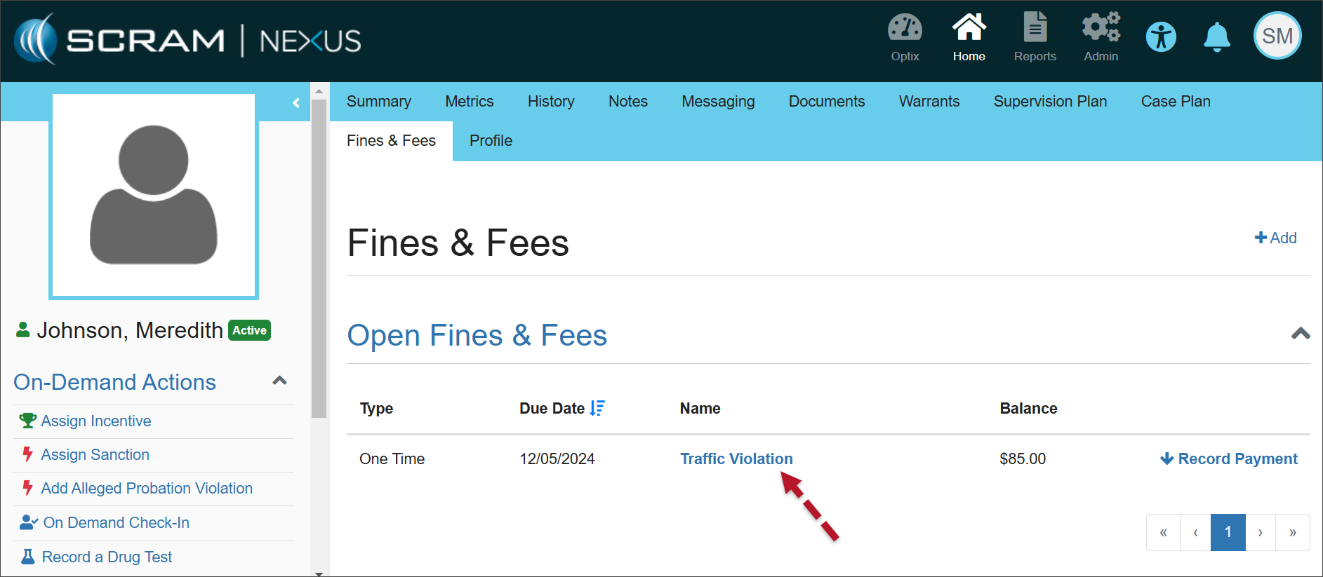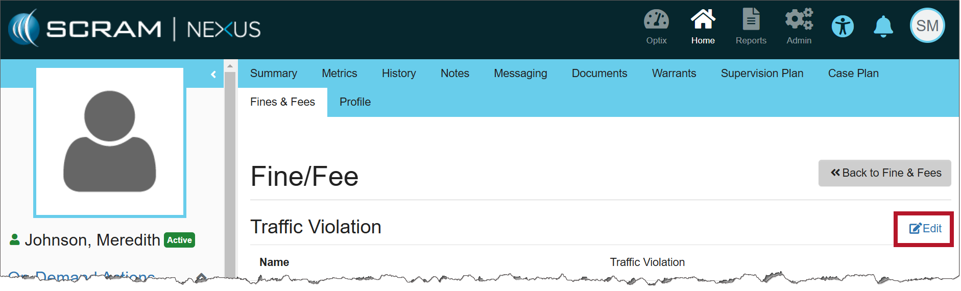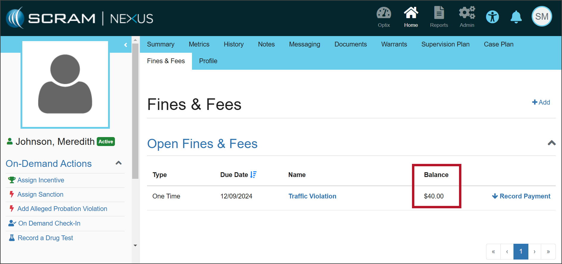 The second enhancement is SCRAM Nexus Fines & Fees. Once enabled, you may add, edit, and record payment for any fines and fees issued for the client.