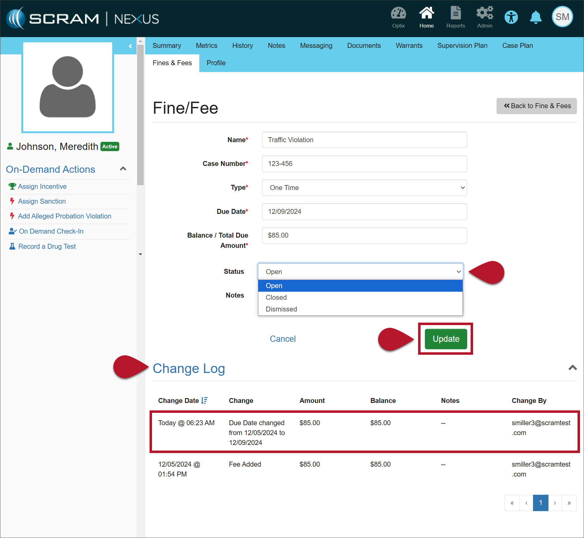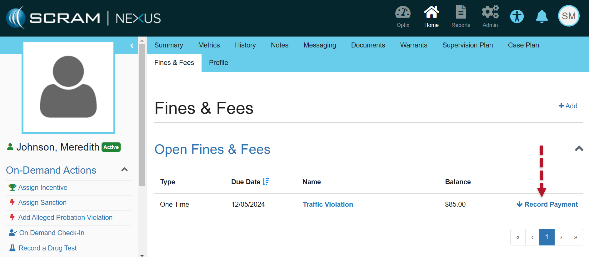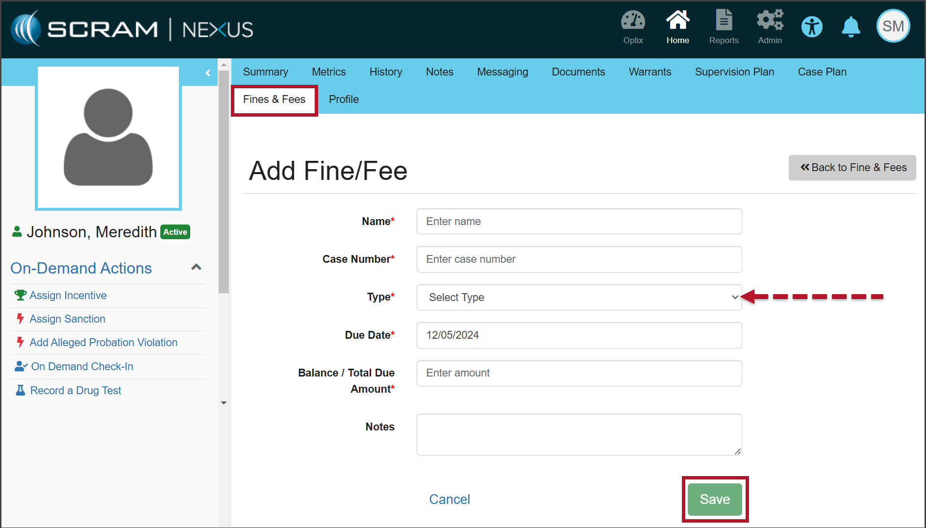The second enhancement is SCRAM Nexus Fines & Fees. Once enabled, you may add, edit, and record payment for any fines and fees issued for the client.