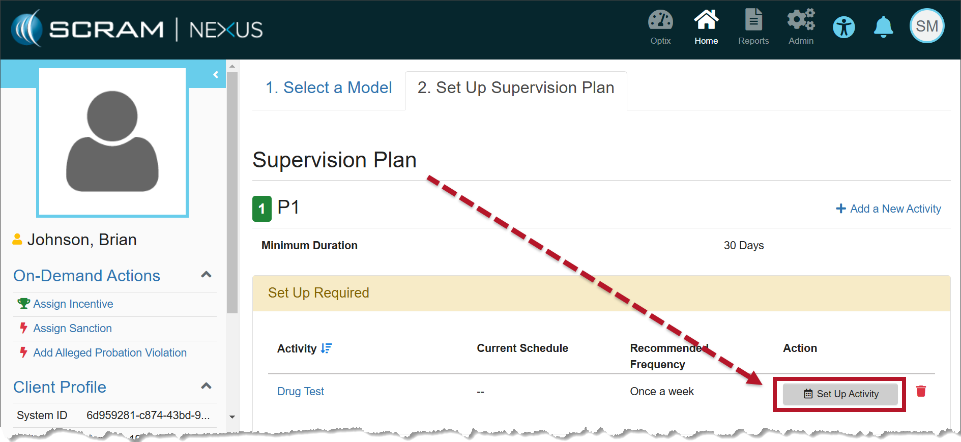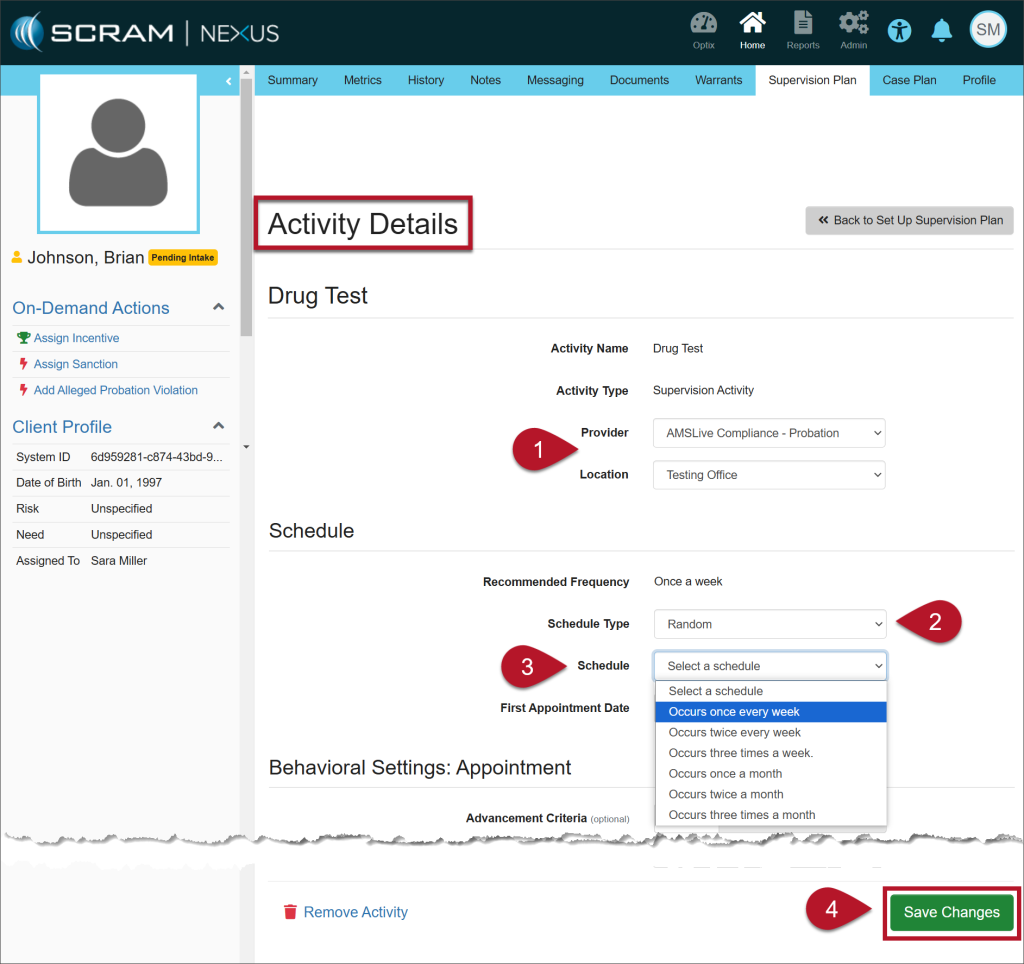 Once enabled, you may select the Random schedule option when adding a Drug Test Activity to your client’s supervision plan.
