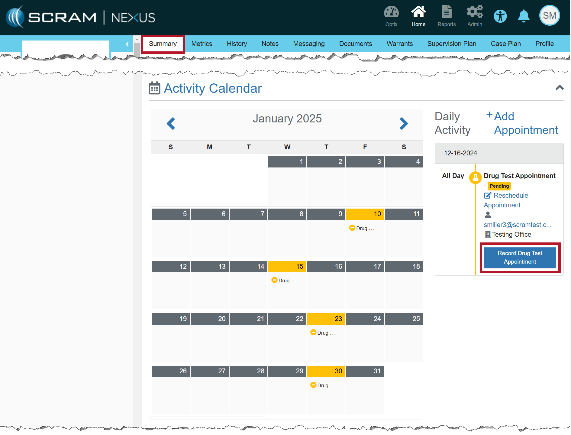 The calendar on the client’s Summary page will display the drug tests interspersed randomly based on the frequency entered.