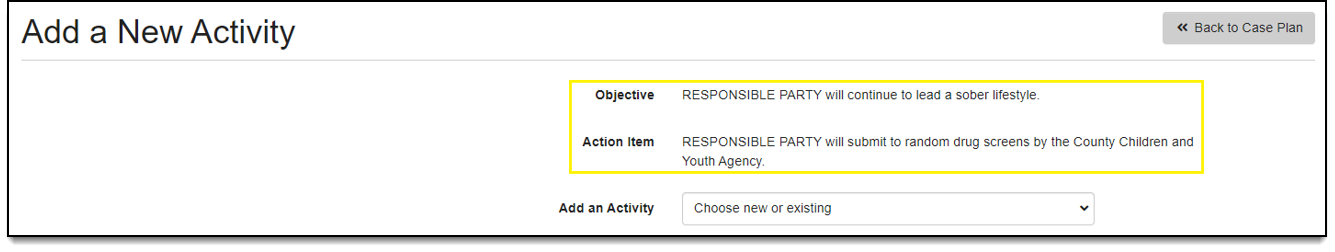 The ‘Suggested Activity’ field is now included in the Action Items catalog. When adding or editing an action item, an administrator can include a ‘suggested activity’. The suggested activity will eventually be displayed on the case plan to help guide the caseworker when adding activities to the plan. This field is optional and there is no limit on the number of suggested activities that can be added to each action item.