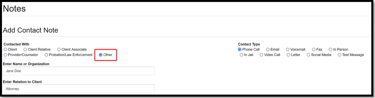 When recording a contact note, you now have the option to select an Other radio button, as shown below. With this option selected, you must then enter the name or organization associated with the contact and the relation of the contact to the client.