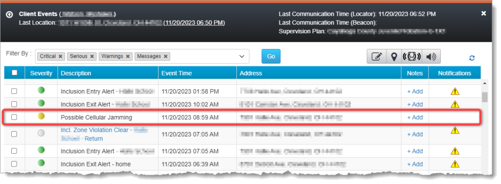 Possible Cellular Jamming Alert on the Client Events Dialog (click to enlarge)