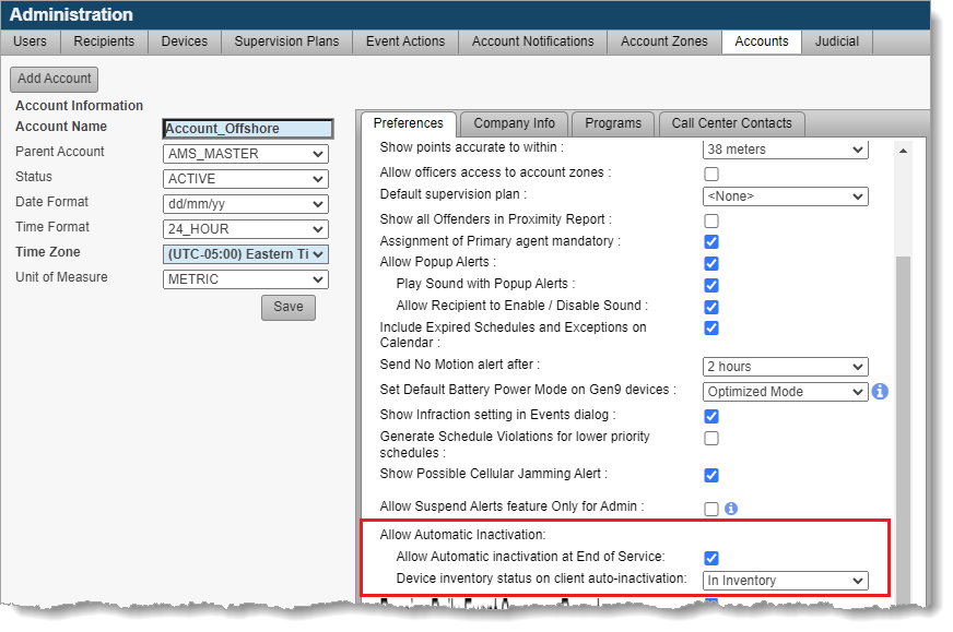 This reason is in line with the American Probation and Parole Association’s National Standards for Community Supervision. To activate this feature in SCRAMNET GPS, a program Administrator must navigate to Admin > Account Settings > Accounts (tab) > Preferences (sub-tab) and then select (check) Allow Assignment of Inactivation Statuses.