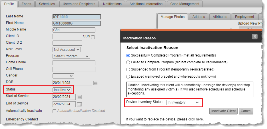 Clients can be manually inactivated from the Client Profile page, and this action unassigns the GPS device. The Inactivation Reason confirmation dialog allows you to set the Device Inventory Status.