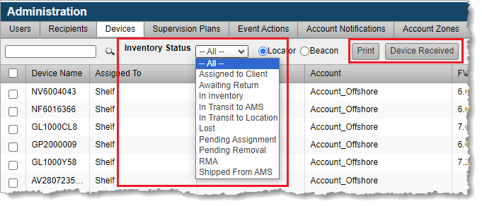 Filter devices using the Inventory Status dropdown menu and, optionally, Print the report. Select the appropriate device and click Device Received to change the device’s inventory status to “In Inventory;” so it can be assigned to another client.