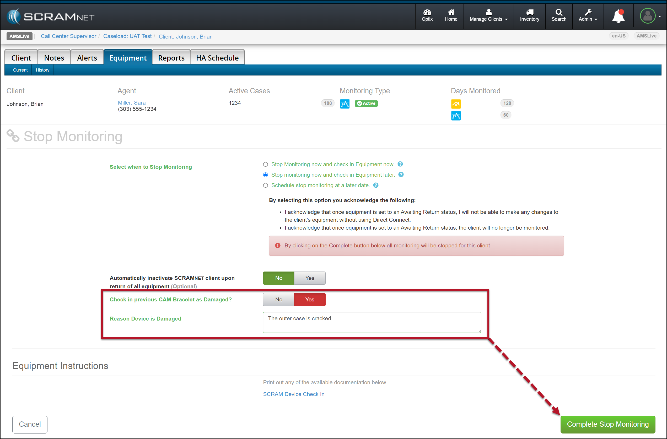 - Removal without Reinitialization – Removal without re-initialization – CLIENT IS NOT BEING MONITORED. Need to meet with client to perform a re-initialization. First, utilize the Maintenance Link. Second, reinstall bracelet to the proper fit. Third, perform a direct connect. Once the bracelet receives the required initialization this alert will auto resolve, and monitoring can begin. Click the Maintenance button below to begin the process.