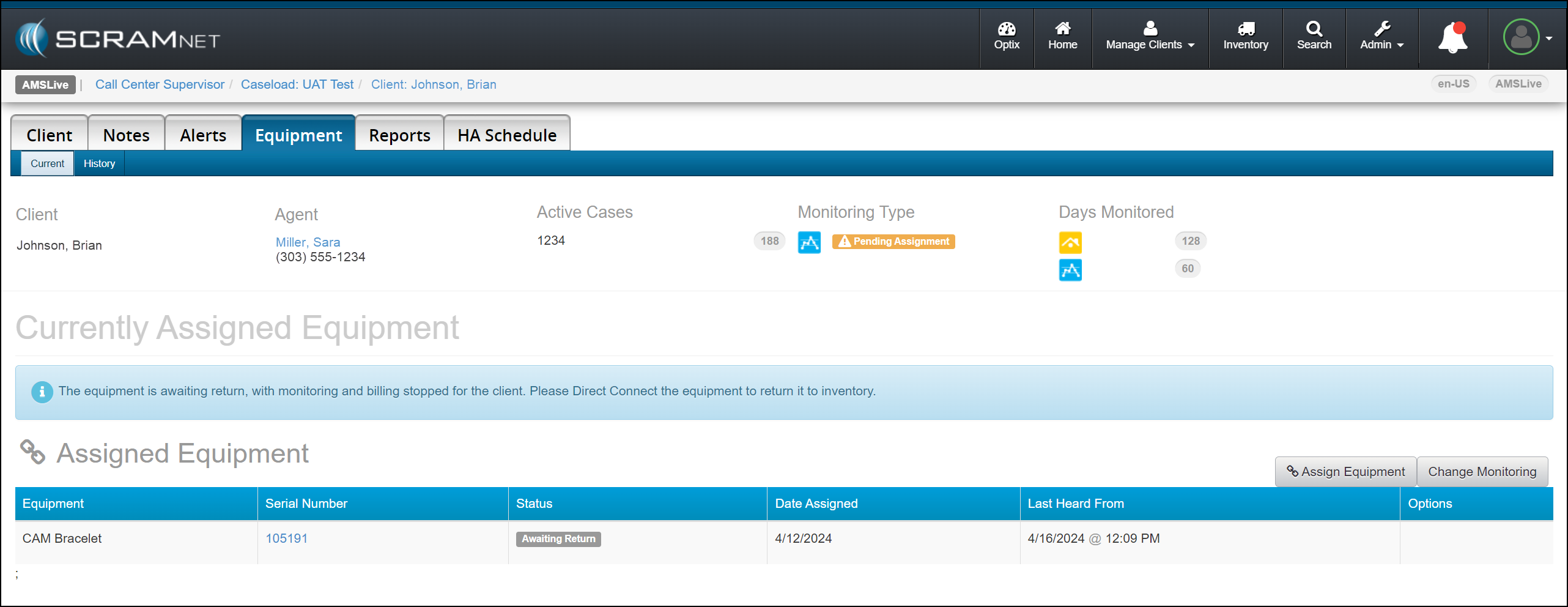 - Assigned Off Body – Assigned off body – CLIENT IS NOT BEING MONITORED. Need to meet with client to perform a re-initialization. First, utilize the Maintenance Link. Second, inspect client’s bracelet to ensure a proper fit. If the bracelet is not fit properly, please remove and reinstall to the proper fit. Third, perform a direct connect. Once the bracelet receives the new initialization, this alert will auto resolve. Click the Maintenance button below to begin the process.