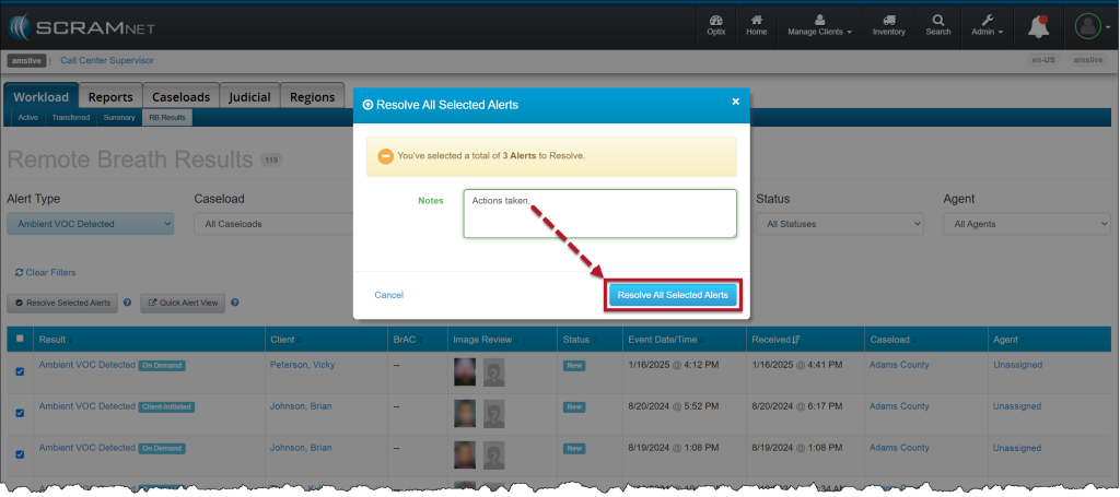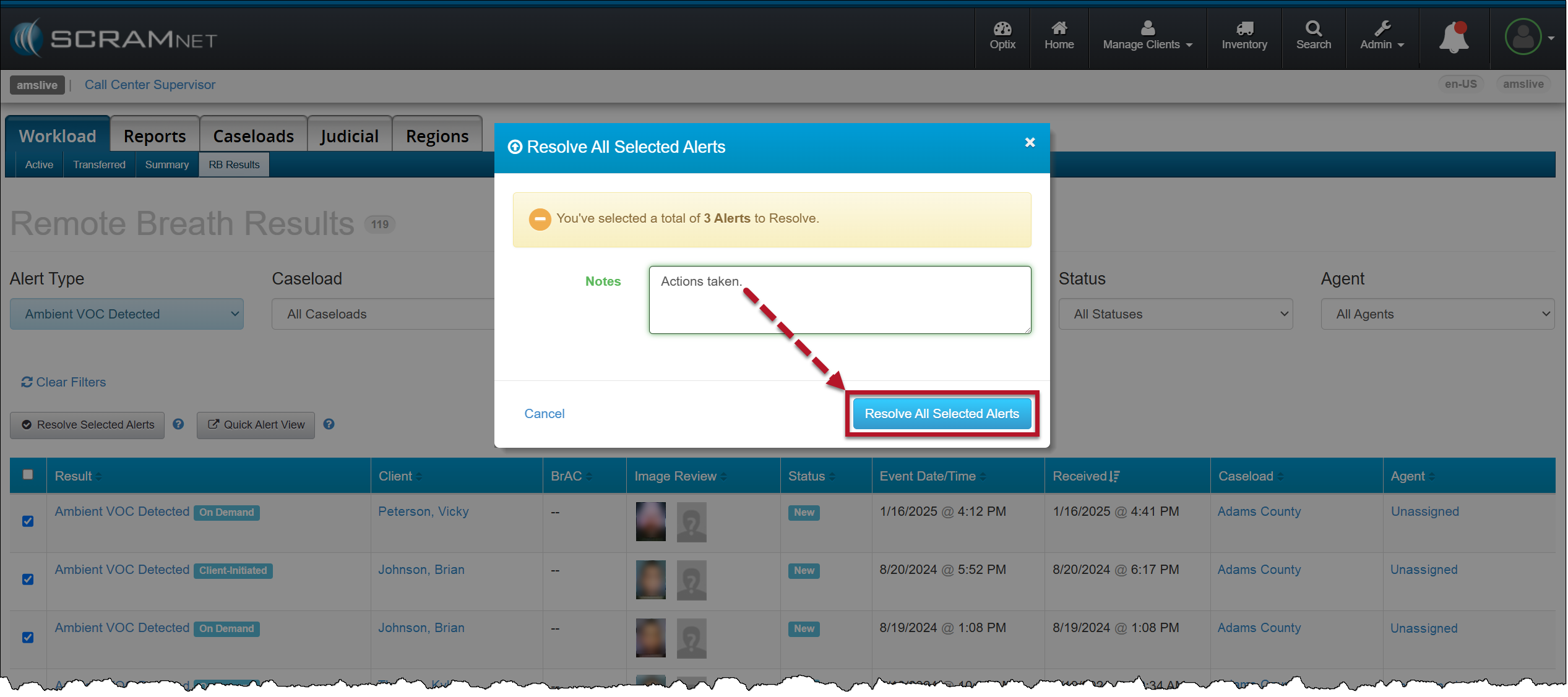 - Once all required actions are completed and recorded in SCRAMNET, the system will automatically resolve the alert.